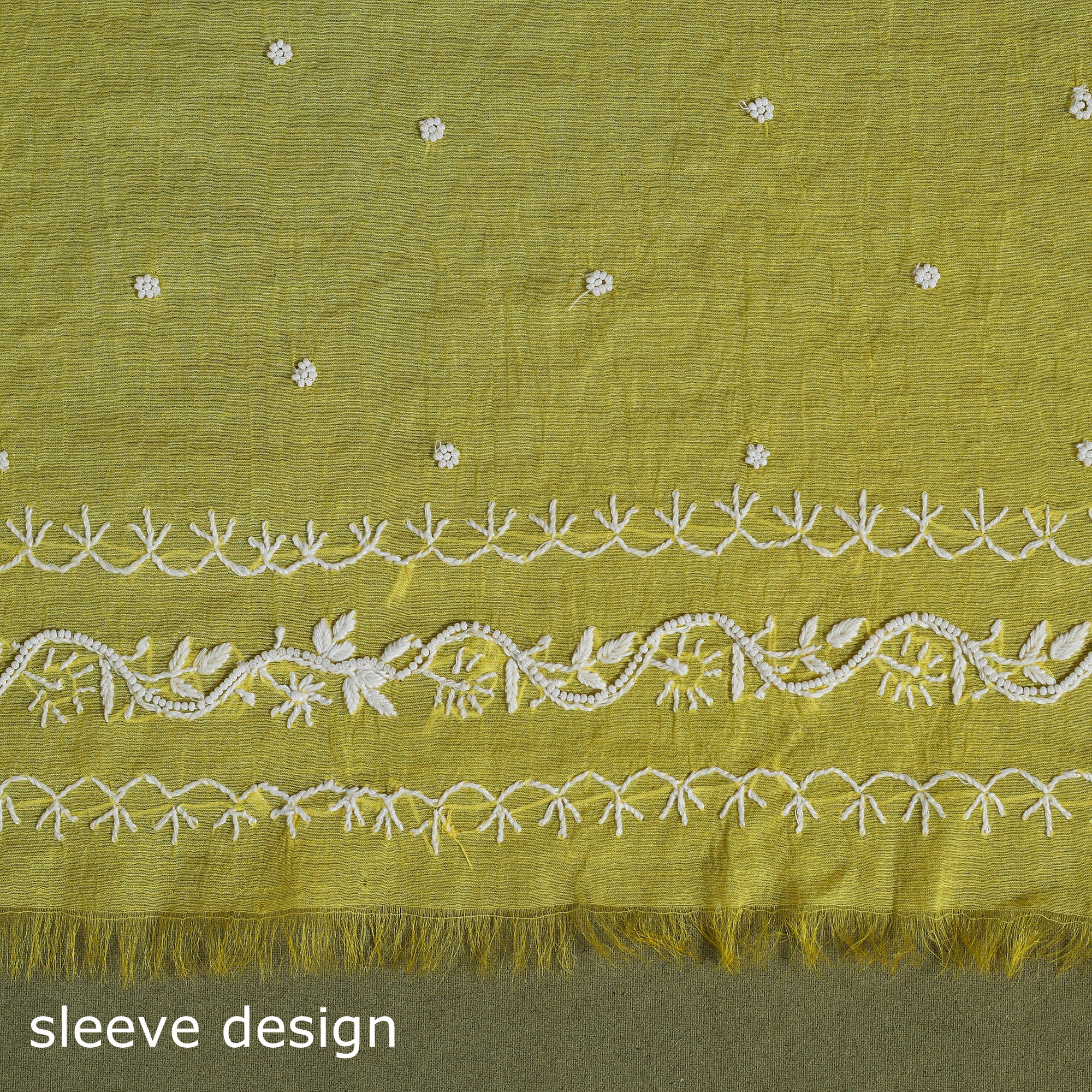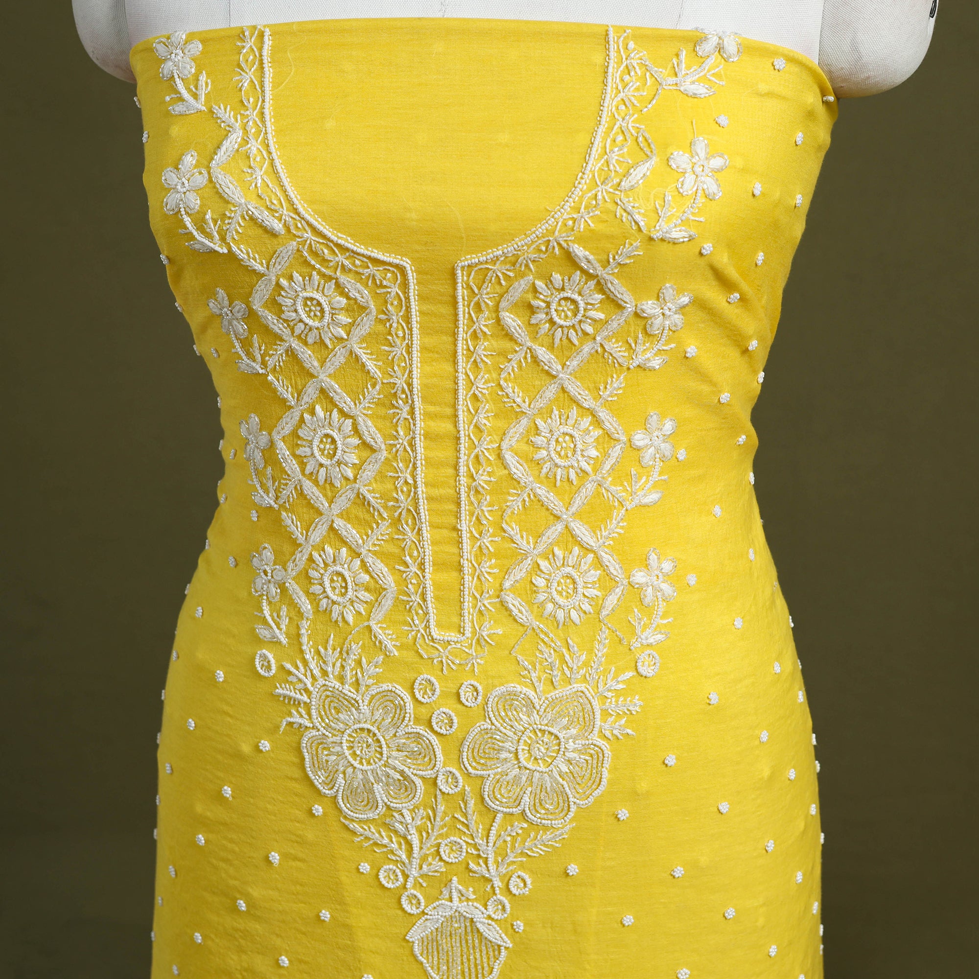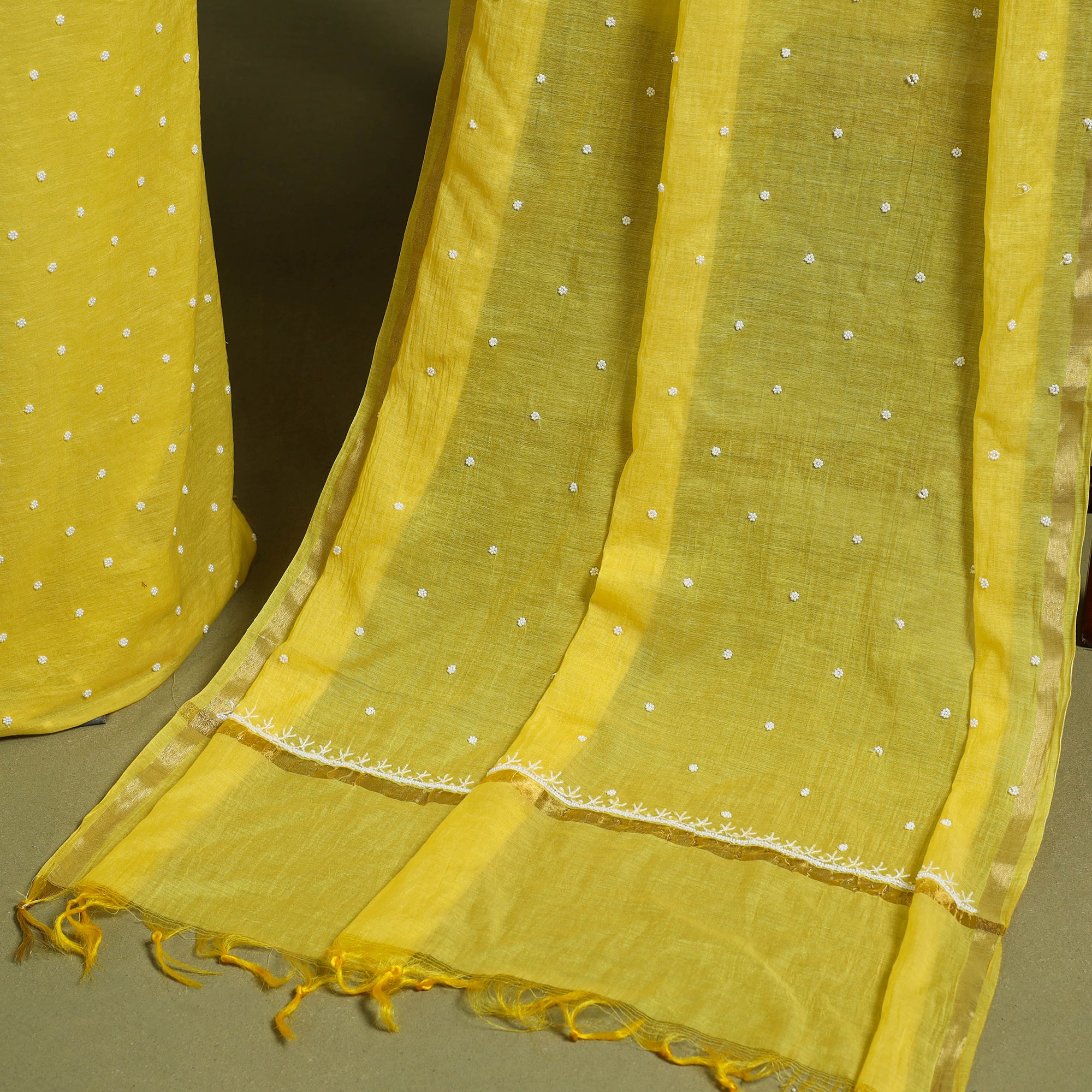 2pc yellow chikankari dress material set includes a beautifully hand-embroidered kurta with a matching dupatta, both crafted in chanderi silk x mul cotton. The dupatta is enhanced with delicate zari borders and tassels. Chikankari, a traditional embroidery art from Lucknow, showcases fine craftsmanship and cultural heritage.