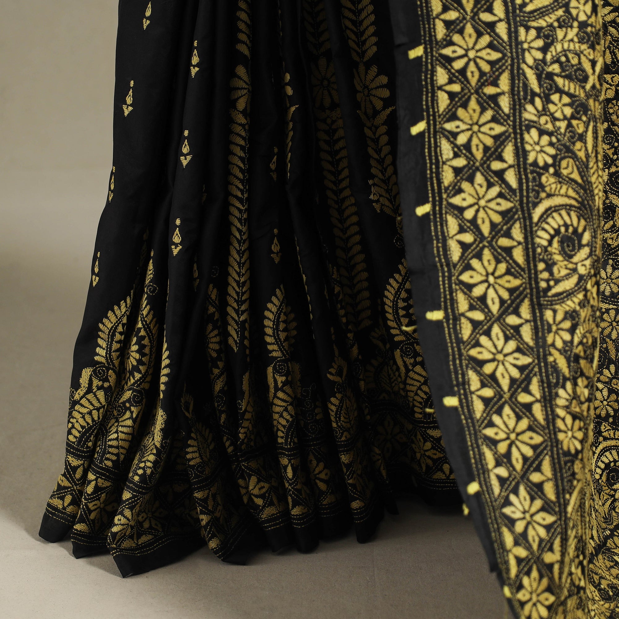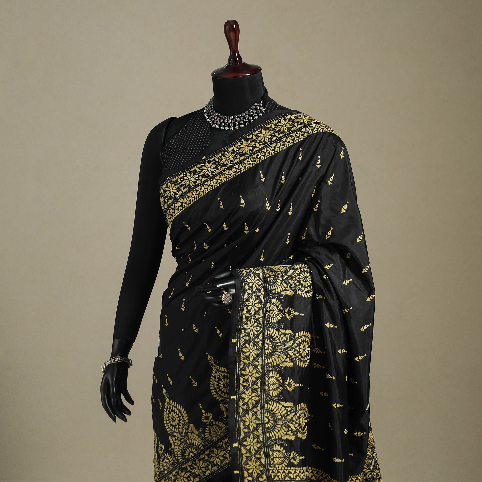 This fine black handloom pure bangalore silk saree features intricate kantha hand embroidery from West Bengal. The saree blends contemporary patterns with timeless kantha detailing on lustrous Bangalore silk, known for purity and texture. Perfect for weddings, festive occasions, cultural gatherings, or as an heirloom piece celebrating India’s textile legacy.