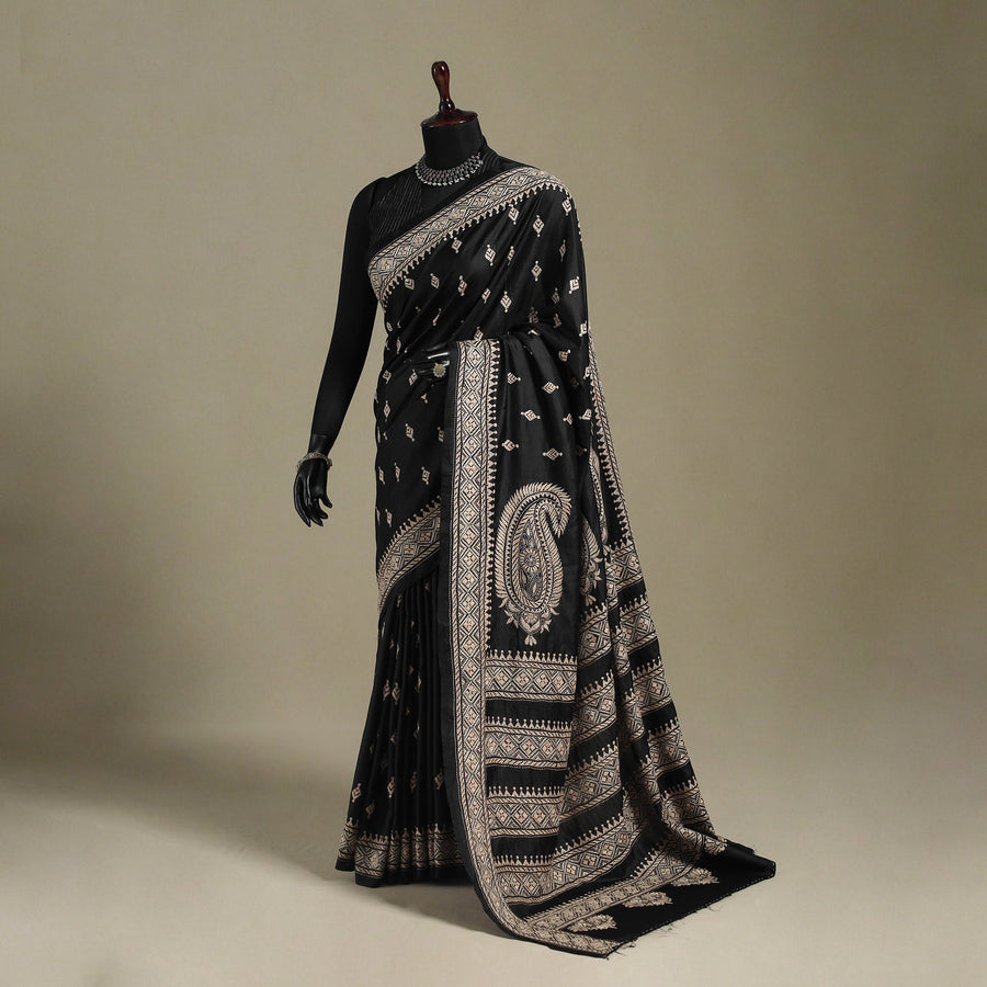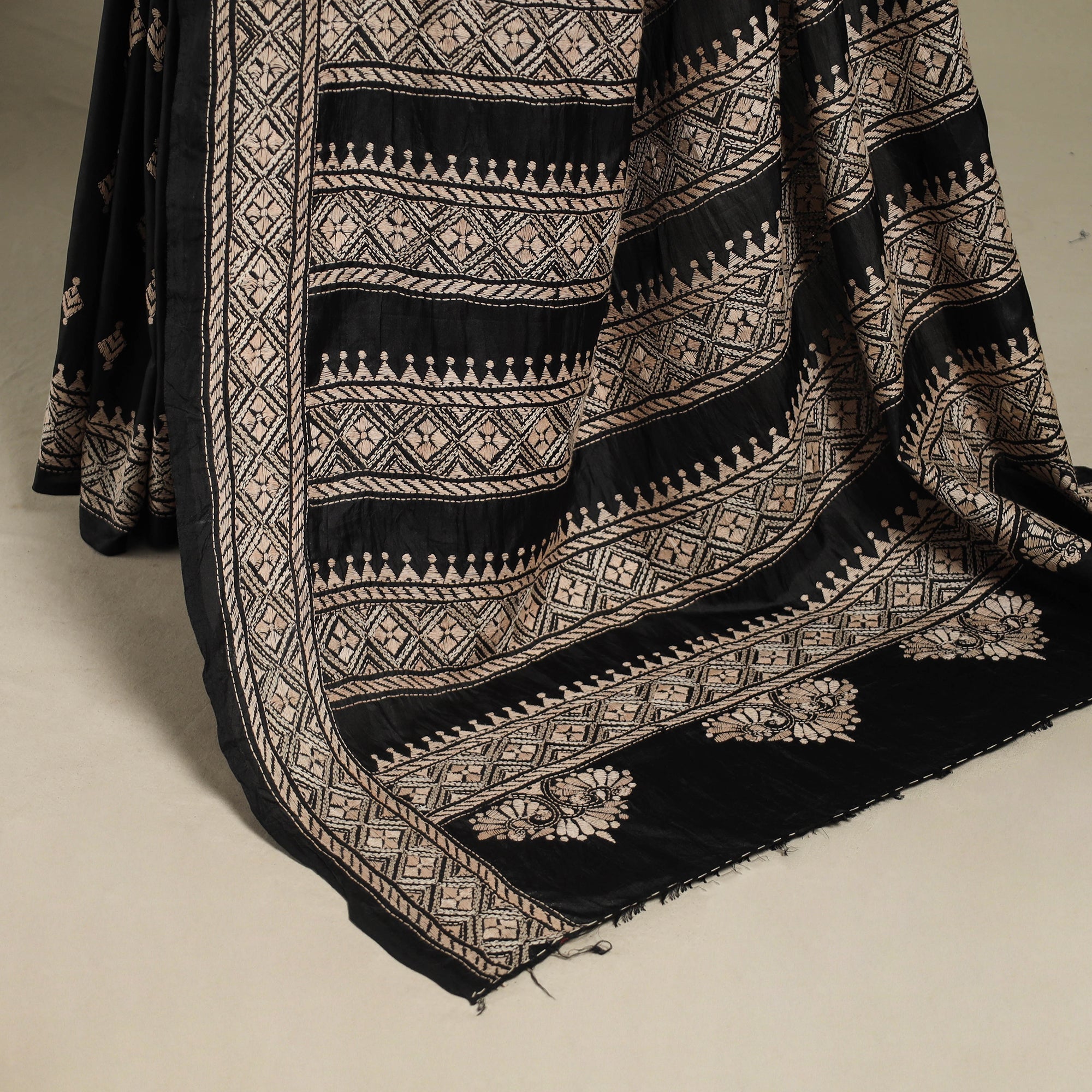 This fine black handloom pure bangalore silk saree features intricate kantha hand embroidery from West Bengal. The saree blends contemporary patterns with timeless kantha detailing on lustrous Bangalore silk, known for purity and texture. Perfect for weddings, festive occasions, cultural gatherings, or as an heirloom piece celebrating India’s textile legacy.