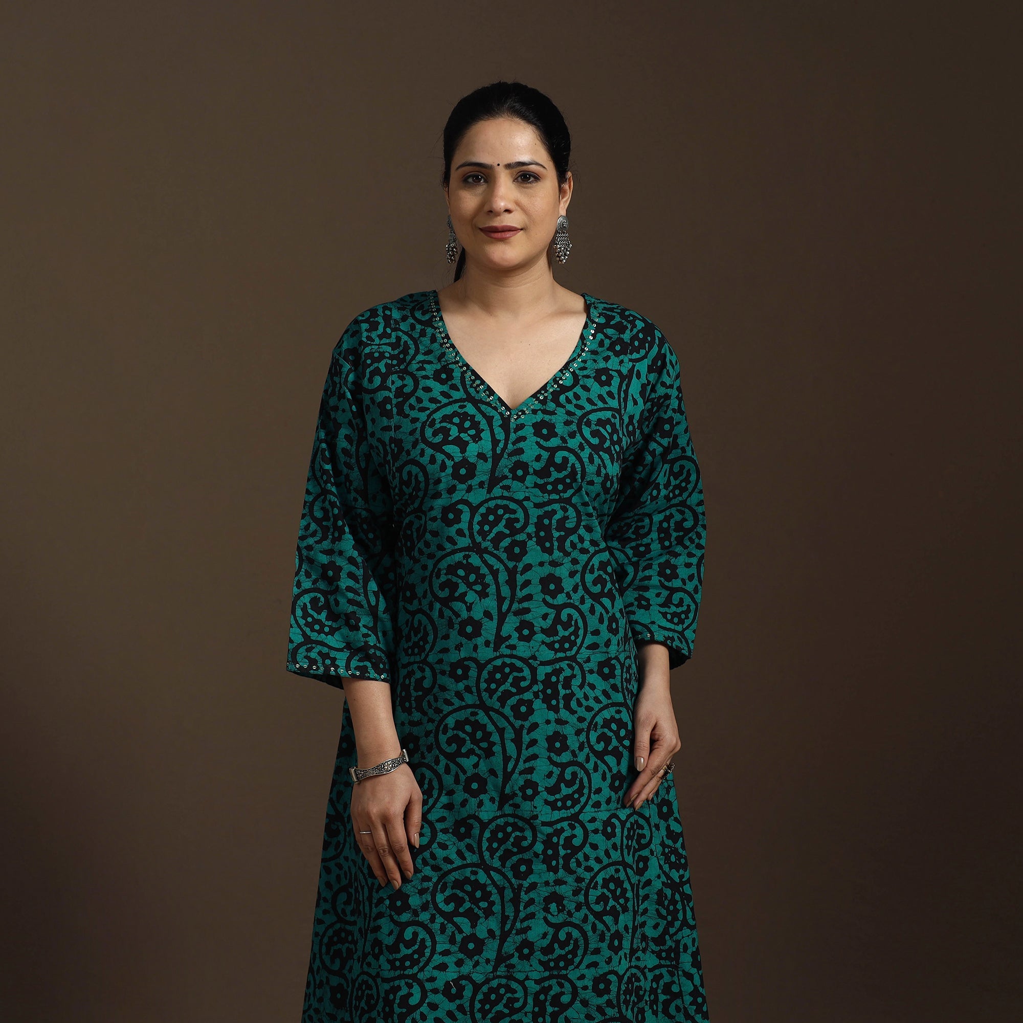 Green - Hand Embroidery Cotton A-Line Batik Print Kurta for women 04