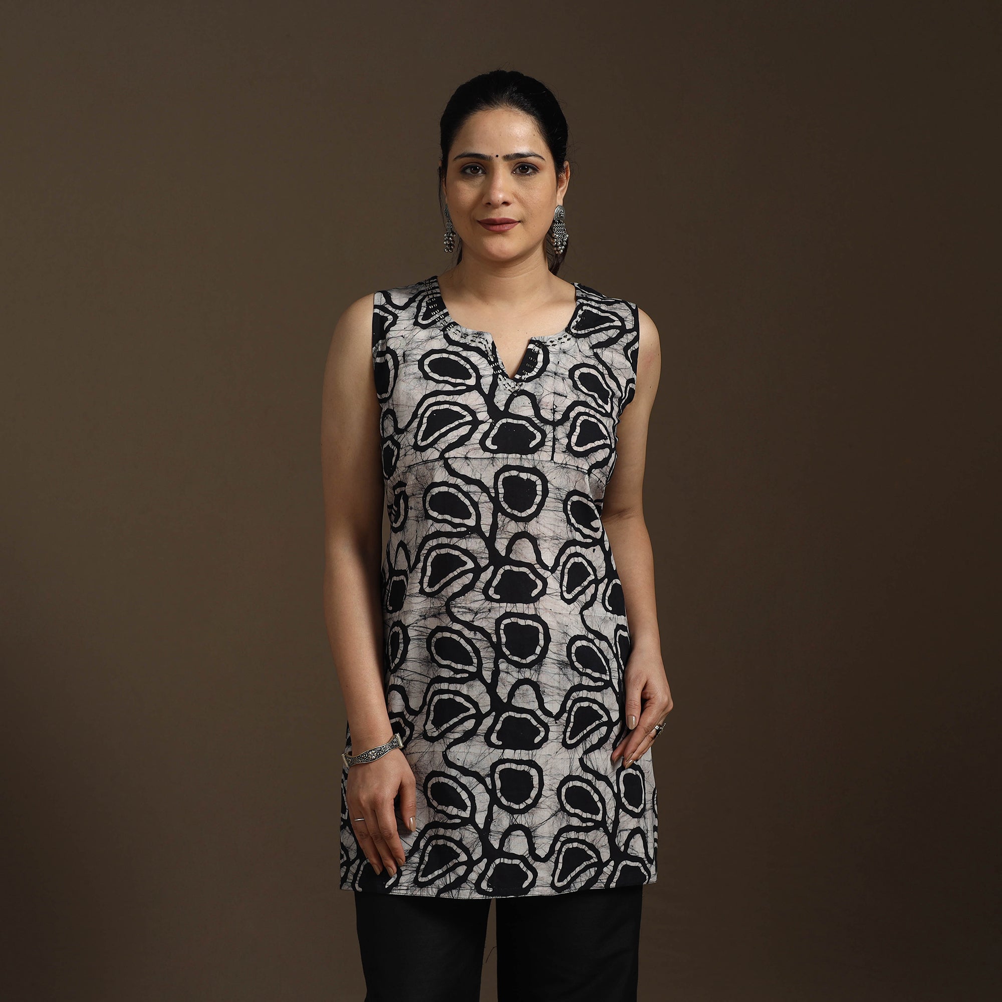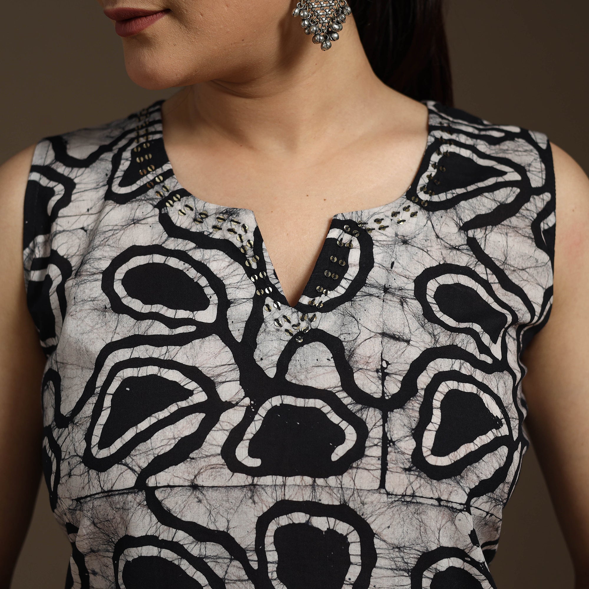 This black cotton short batik print kurta with hand embroidery is a perfect blend of tradition and comfort. Made using the Batik dyeing technique, where wax and dye create beautiful patterns, each kurta features a unique design. The soft cotton fabric keeps you relaxed all day, while the fine embroidery and comfortable fit make it ideal for casual outings and office wear.