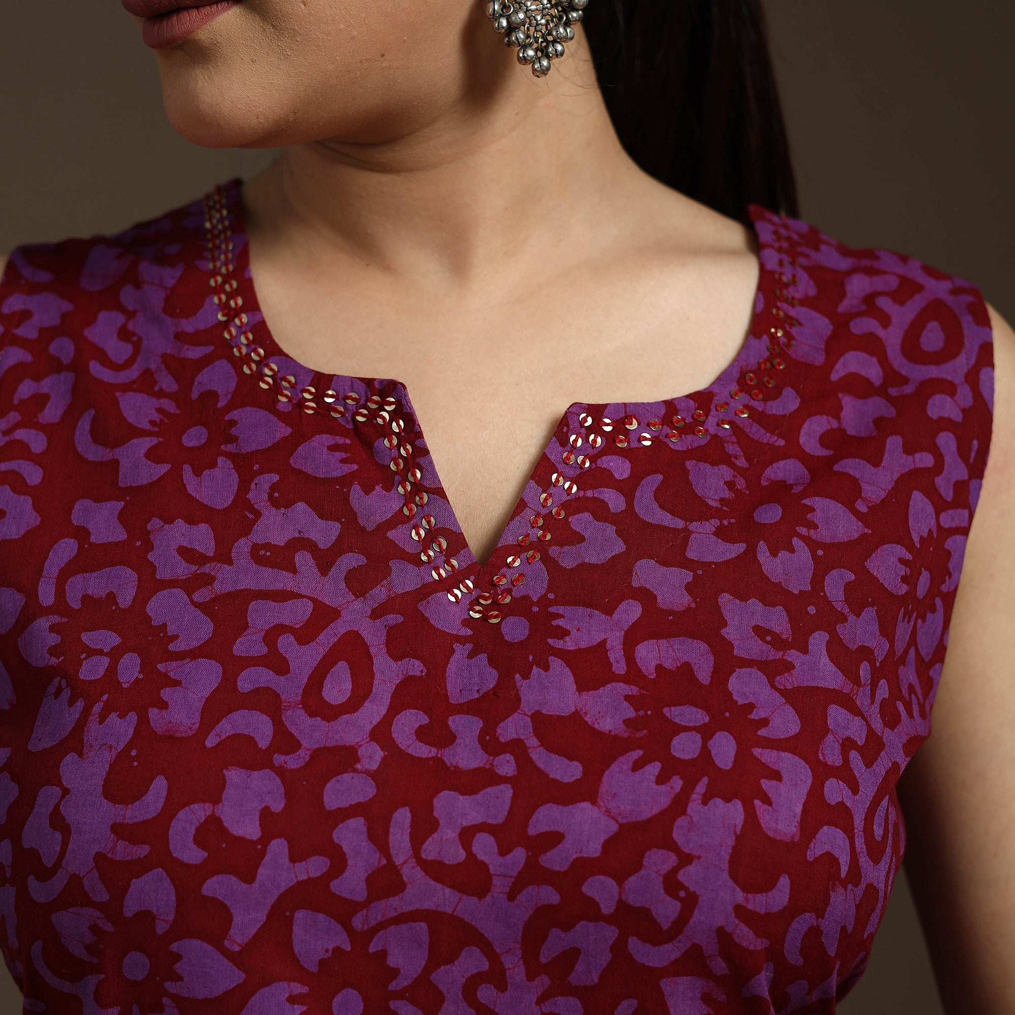 Red - Hand Embroidery Cotton A-Line Batik Print Kurta for women 02