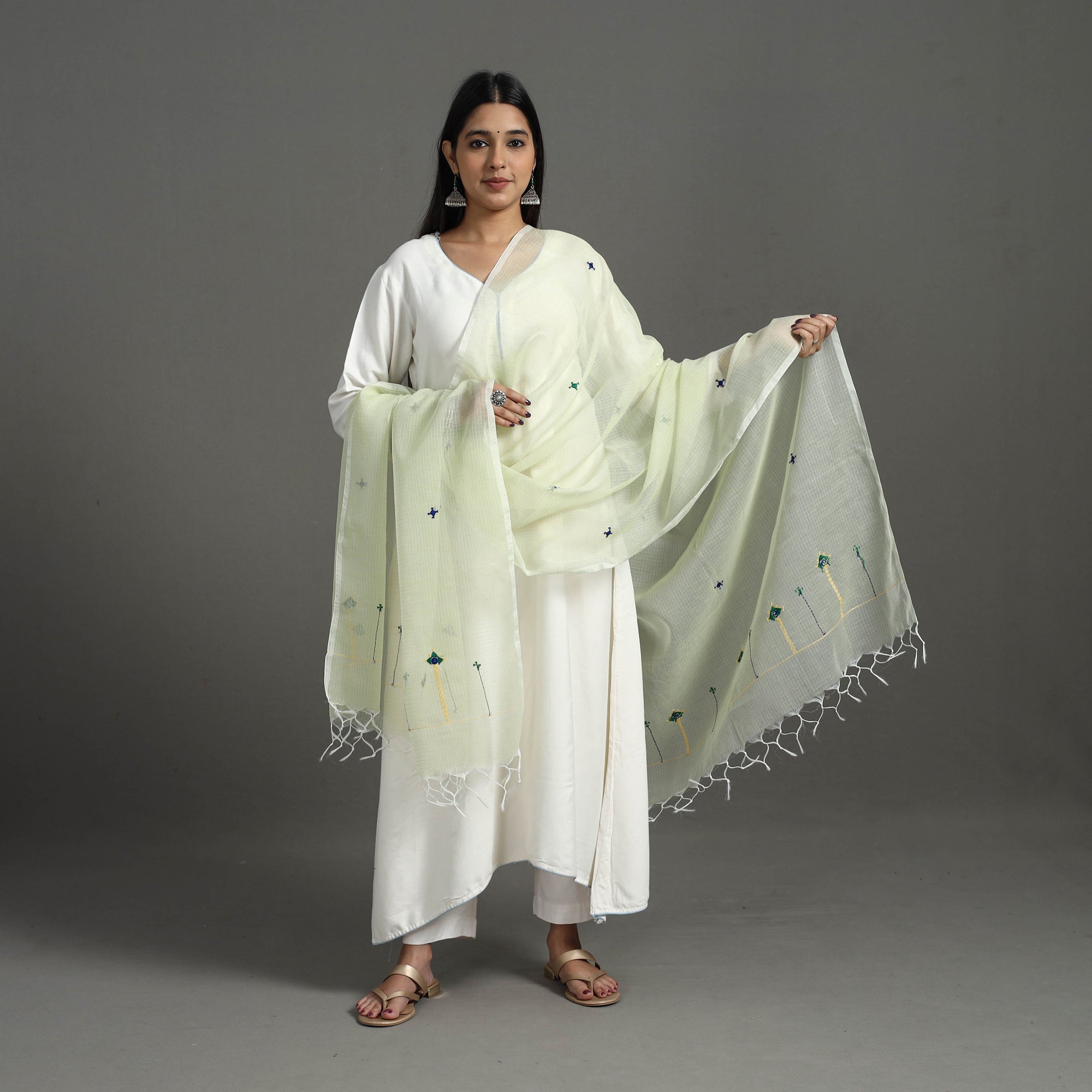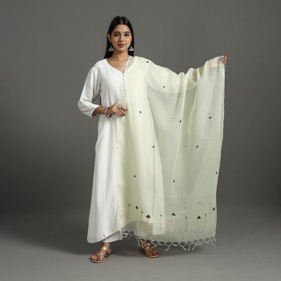 This yellow hand embroidery cotton kota doria dupatta brings the beauty of Barmer's artisanal tradition. Made from a blend of cotton and lustrous silk. The check patterns are delicately interwoven, creating a lightweight, sheer fabric with a touch of elegance. Whether it’s a formal event or casual wear, this dupatta is a versatile piece to elevate your look.
