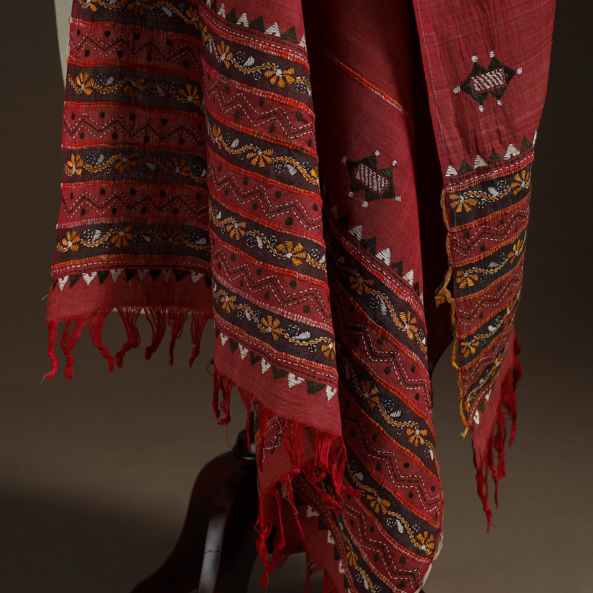 Elevate your wardrobe with this red bengal kantha work dupatta featuring tassels, crafted from recycled khesh cotton and adorned with intricate hand embroidery. Kantha is a traditional craft of West Bengal, where artisans use simple running stitches to create