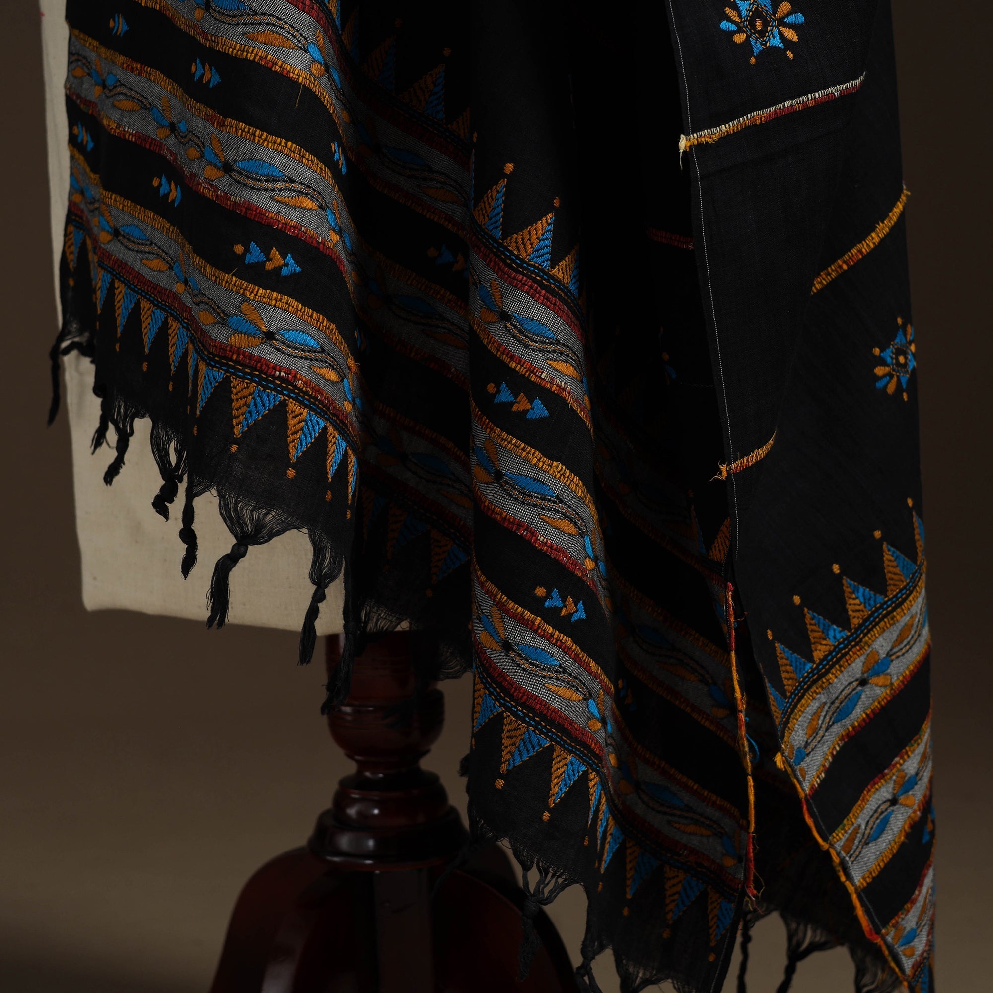 Elevate your wardrobe with this black bengal kantha work dupatta featuring tassels, crafted from recycled khesh cotton and adorned with intricate hand embroidery. Kantha is a traditional craft of West Bengal, where artisans use simple running stitches to create