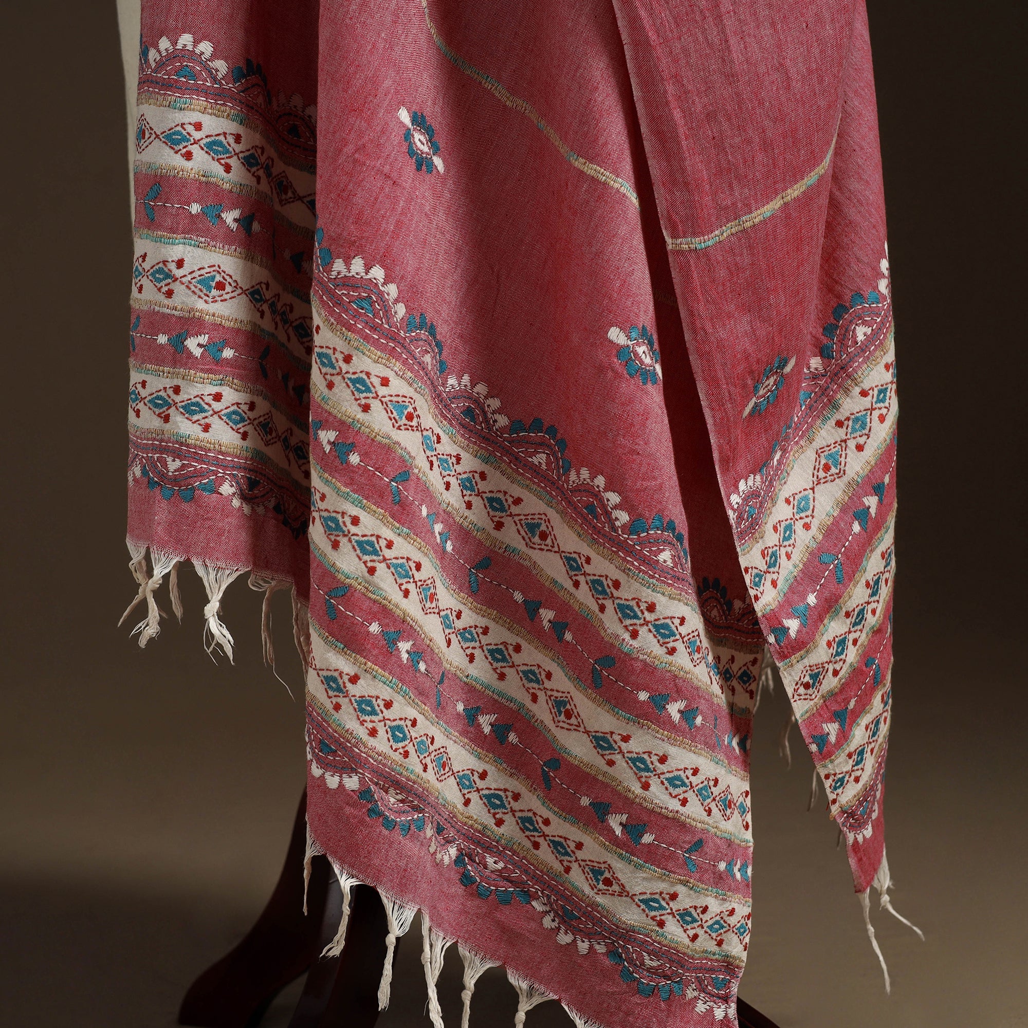 Elevate your wardrobe with this pink bengal kantha work dupatta featuring tassels, crafted from recycled khesh cotton and adorned with intricate hand embroidery. Kantha is a traditional craft of West Bengal, where artisans use simple running stitches to create