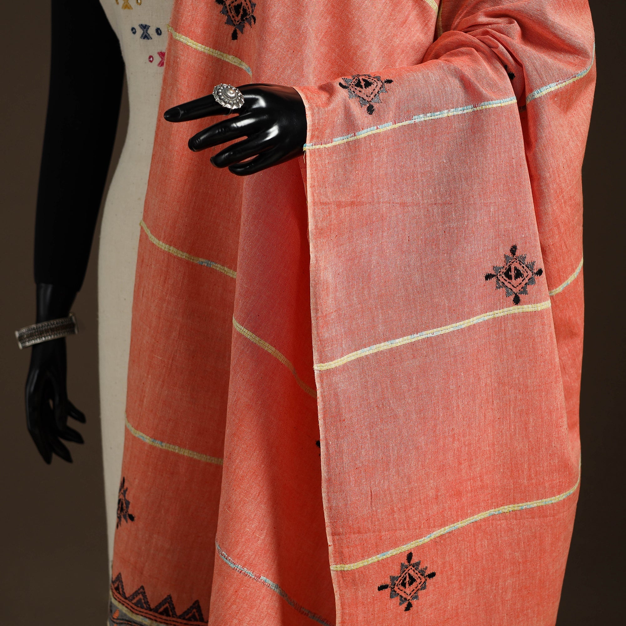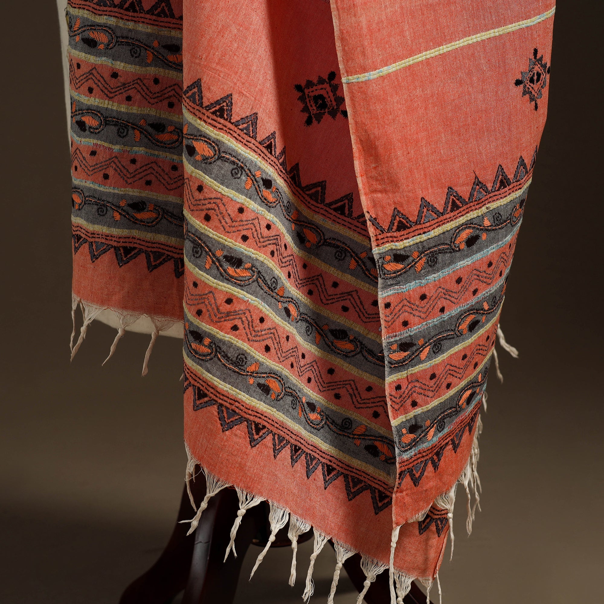 Elevate your wardrobe with this peach bengal kantha work dupatta featuring tassels, crafted from recycled khesh cotton and adorned with intricate hand embroidery. Kantha is a traditional craft of West Bengal, where artisans use simple running stitches to create
