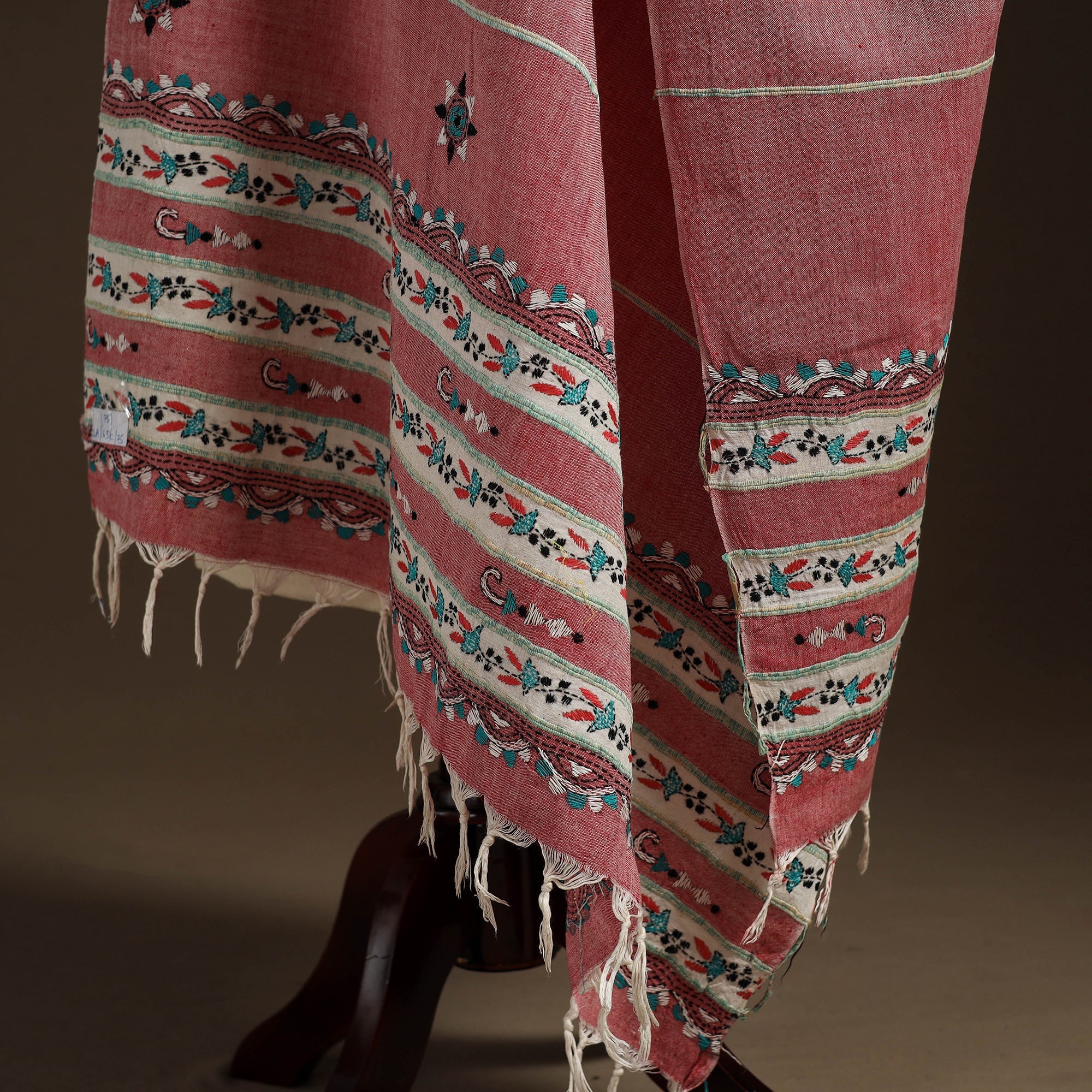 • Pink Hand Embroidery Khes Handwoven Cotton Kantha Dupatta