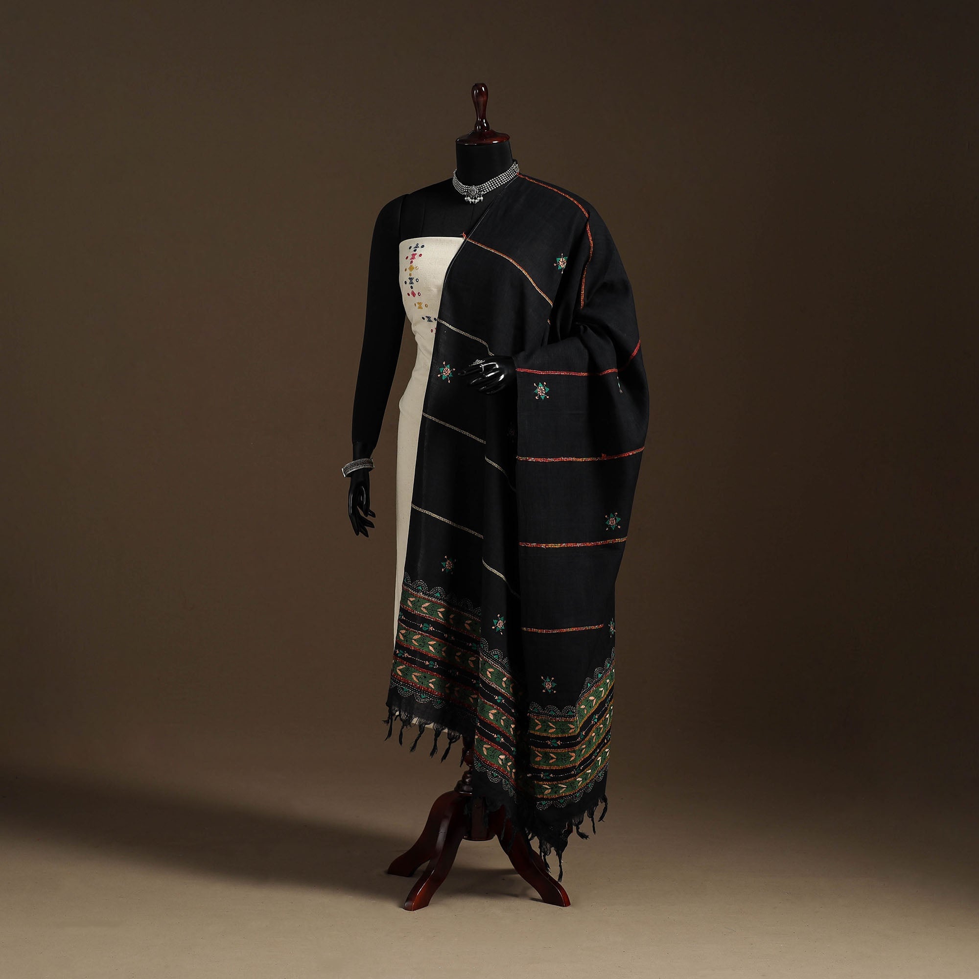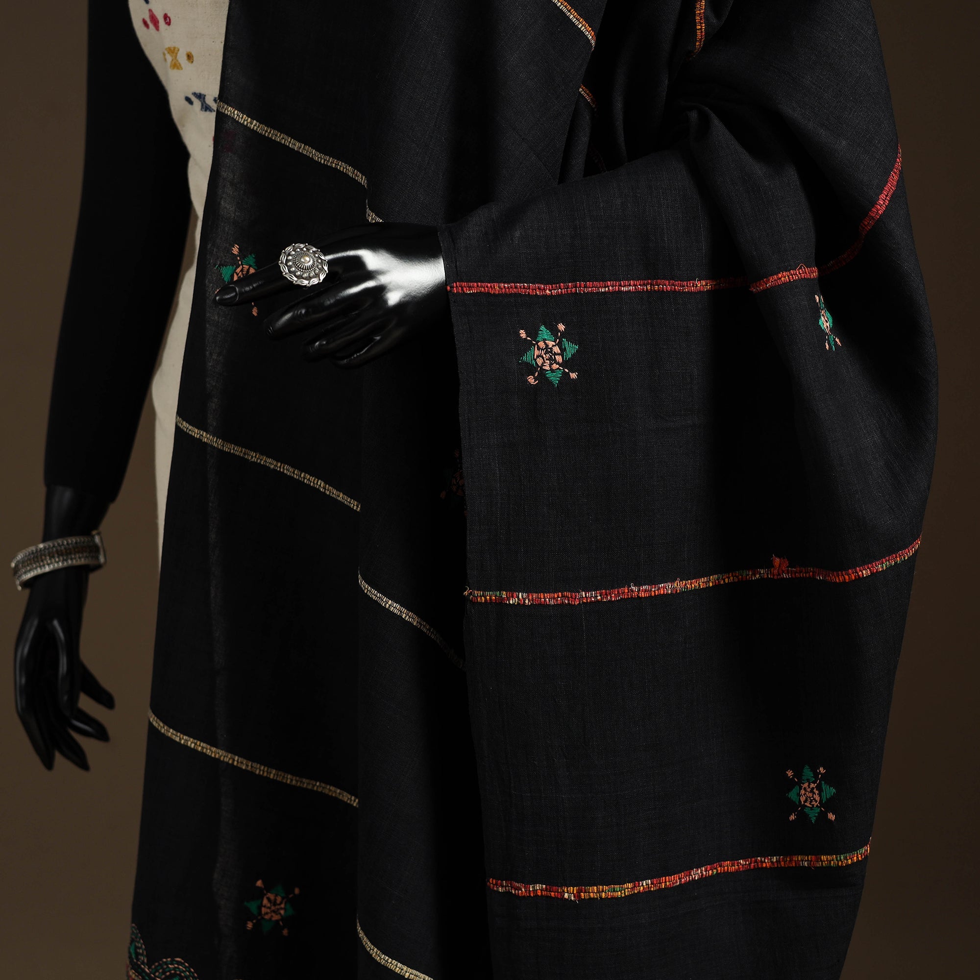 Elevate your wardrobe with this black bengal kantha work dupatta featuring tassels, crafted from recycled khesh cotton and adorned with intricate hand embroidery. Kantha is a traditional craft of West Bengal, where artisans use simple running stitches to create