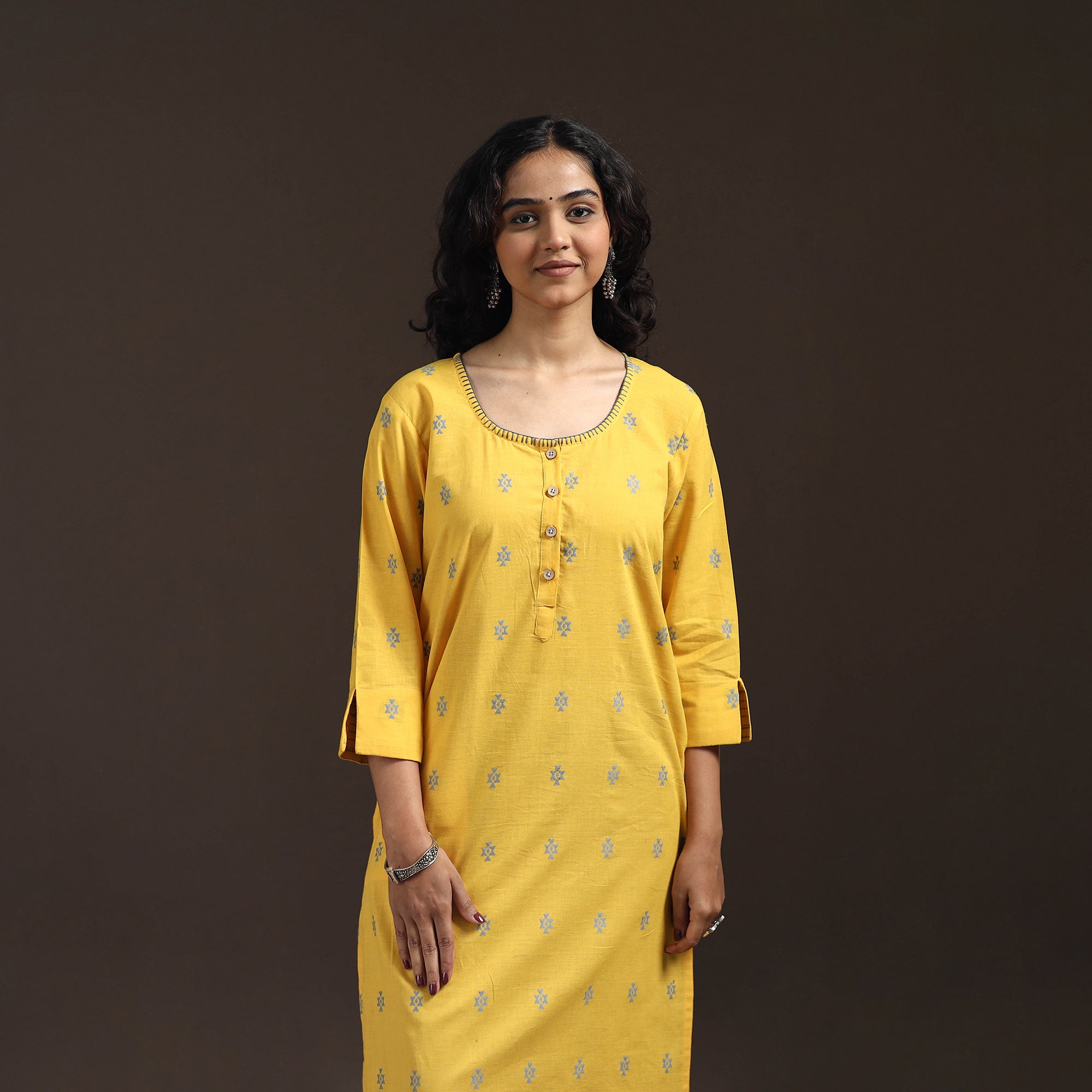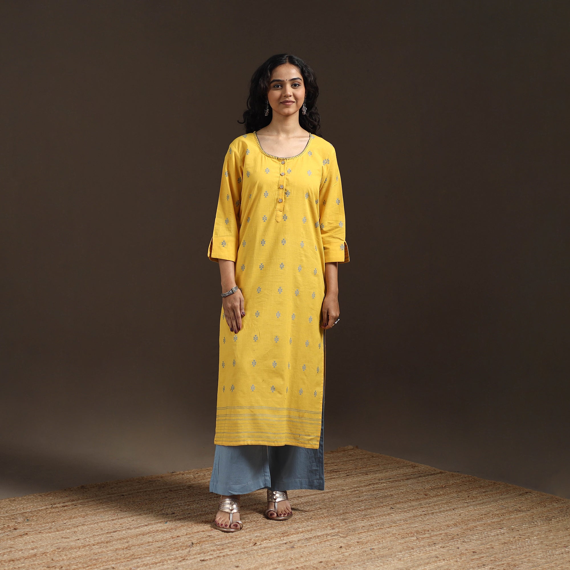Yellow - Hand Embroidery Straight Cotton Jacquard Kurta for women 13
