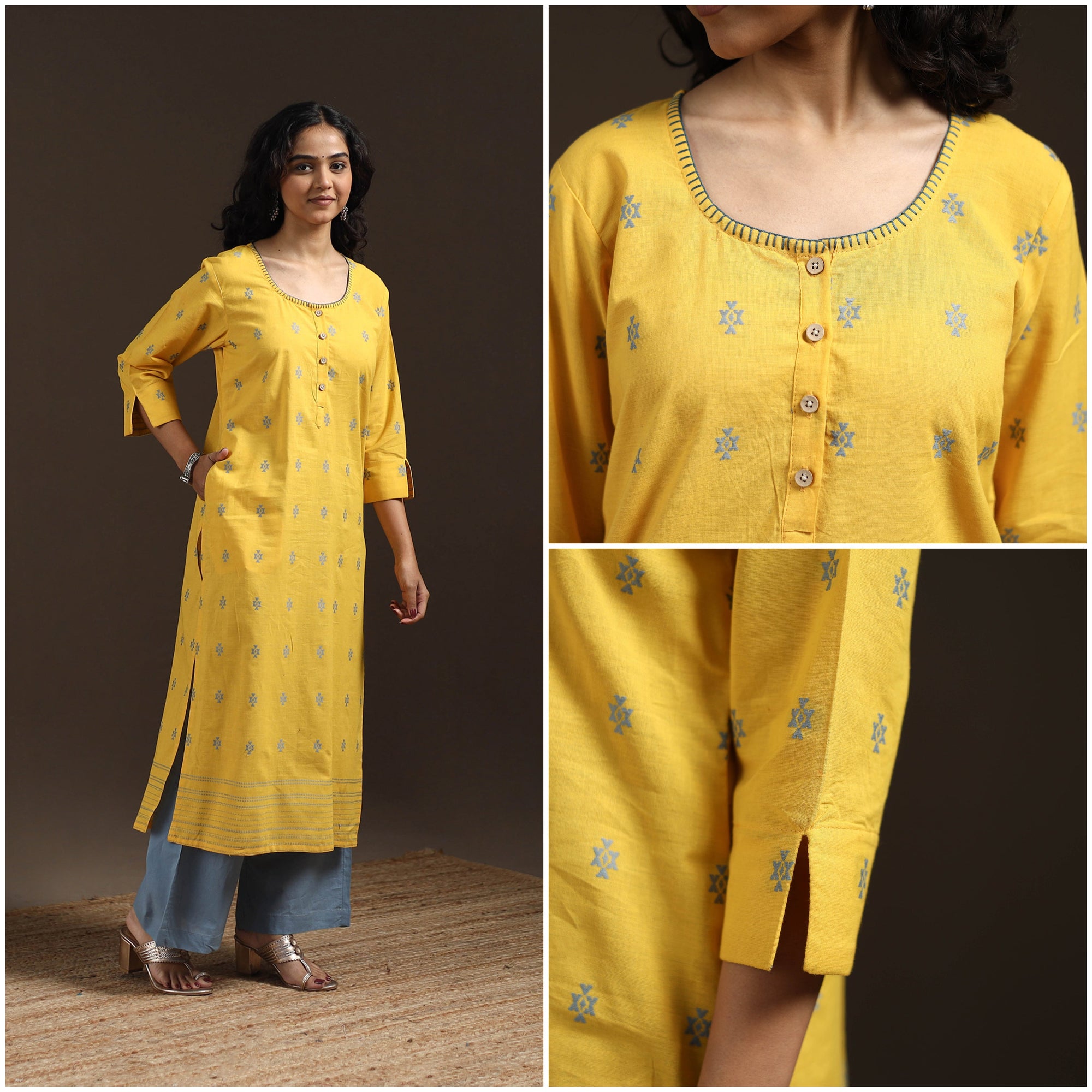 Yellow hand embroidery pure cotton jacquard straight kurta is all about easy wear. The jacquard weave embeds patterns directly into the fabric, adding a soft texture you can both see and feel. Designed with a convenient side pocket for your essentials, this kurta is perfect for office wear or a relaxed day out.