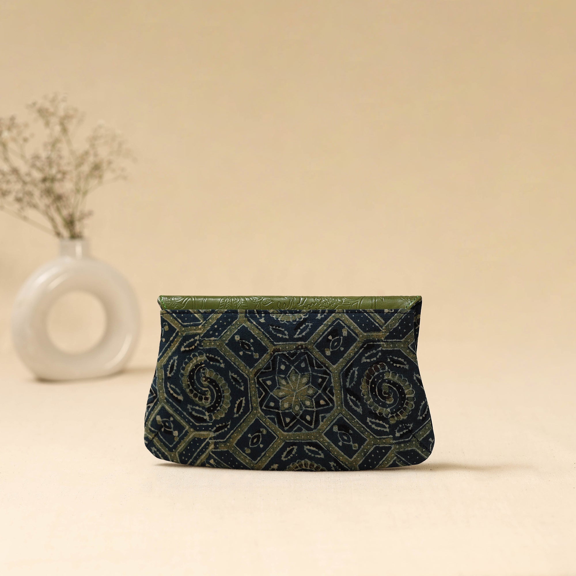 Handcrafted clutch by master artisan Asalkaar from West Bengal, features a hand printed fabric with goat leather flap created using traditional metal die embossing techniques. The flap is individually painted by hand. Inside the clutch is cotton lined and designed with two spacious compartments, two smaller divider pockets in the center and secure zip pocket perfect for organizing essentials like your phone, cards and cash. Over time the leather flap softens and deepens in color adding to its charm.