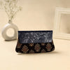This handcrafted black clutch features a hand-printed fabric with a beautifully embossed cruelty-free leather flap, created using traditional vegetable tanning and metal die embossing techniques. The flap is individually painted by hand, giving each piece a distinct look. Inside, the clutch is cotton-lined and thoughtfully designed with two spacious compartments, two smaller divider pockets in the center, and a secure zip pocket perfect for organizing essentials like your phone, cards, and cash. Over time, the leather flap softens and deepens in color, adding to its charm.