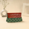 This handcrafted green clutch features a hand-printed fabric with a beautifully embossed cruelty-free leather flap, created using traditional vegetable tanning and metal die embossing techniques. The flap is individually painted by hand, giving each piece a distinct look. Inside, the clutch is cotton-lined and thoughtfully designed with two spacious compartments, two smaller divider pockets in the center, and a secure zip pocket perfect for organizing essentials like your phone, cards, and cash. Over time, the leather flap softens and deepens in color, adding to its charm.
