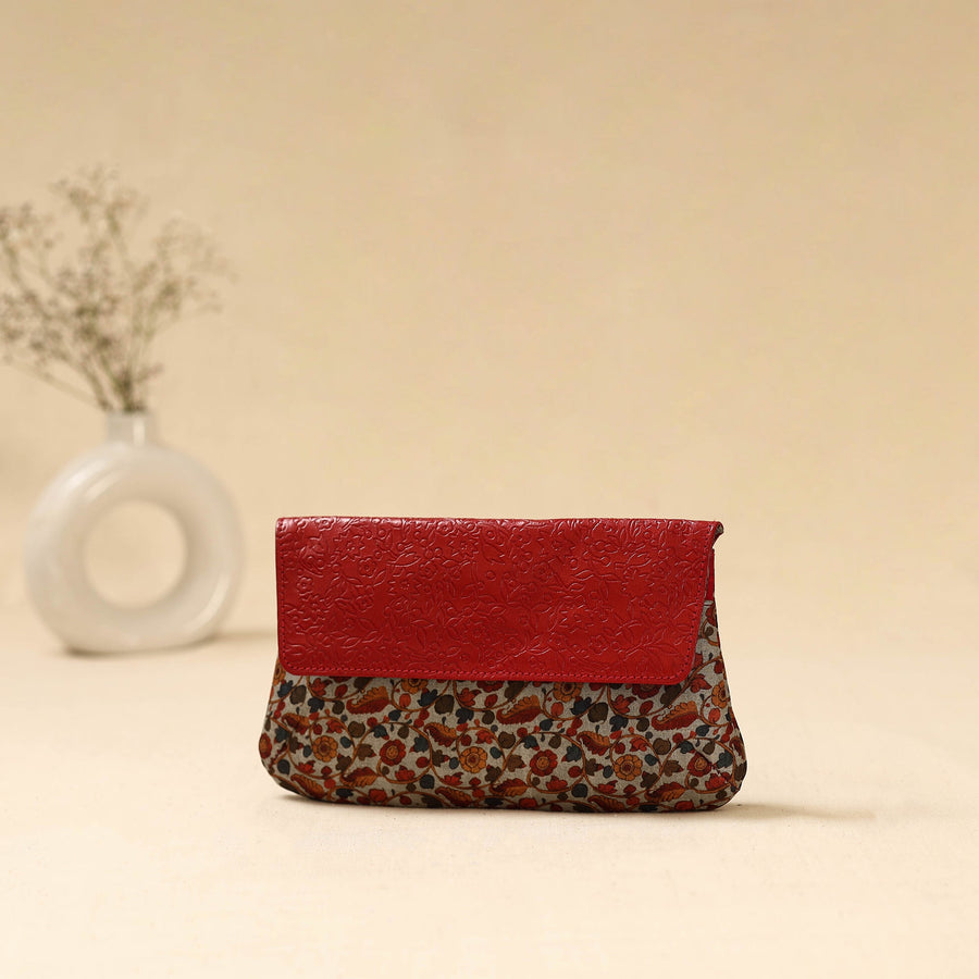 Handcrafted clutch by master artisan Asalkaar from West Bengal, features a hand printed fabric with goat leather flap created using traditional metal die embossing techniques. The flap is individually painted by hand. Inside the clutch is cotton lined and designed with two spacious compartments, two smaller divider pockets in the center and secure zip pocket perfect for organizing essentials like your phone, cards and cash. Over time the leather flap softens and deepens in color adding to its charm.