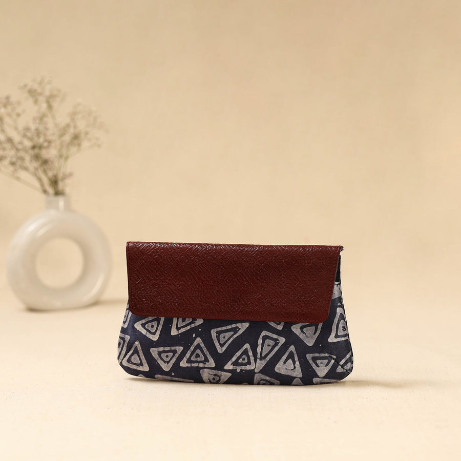 Handcrafted clutch by master artisan Asalkaar from West Bengal, features a hand printed fabric with goat leather flap created using traditional metal die embossing techniques. The flap is individually painted by hand. Inside the clutch is cotton lined and designed with two spacious compartments, two smaller divider pockets in the center and secure zip pocket perfect for organizing essentials like your phone, cards and cash. Over time the leather flap softens and deepens in color adding to its charm.
