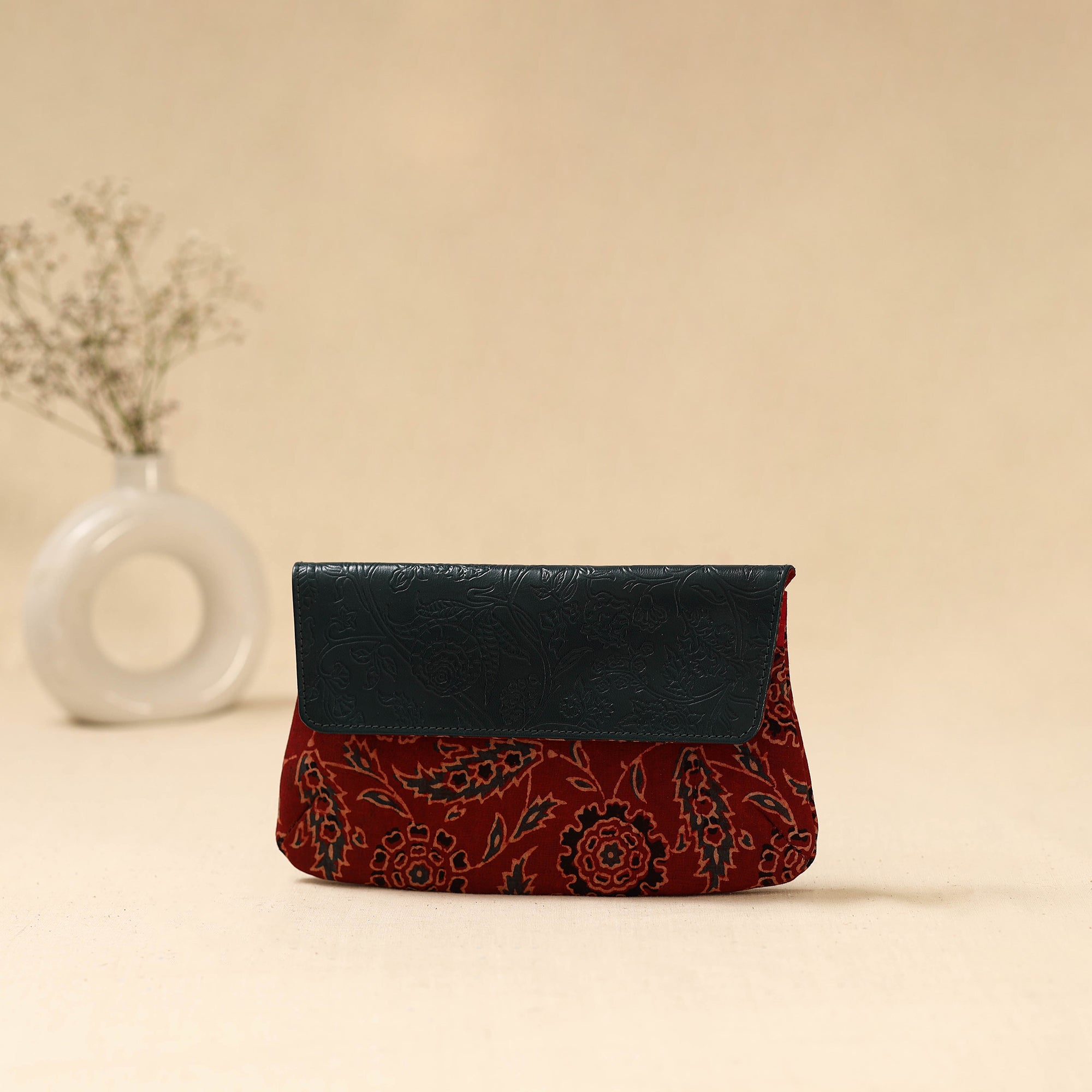 Handcrafted clutch by master artisan Asalkaar from West Bengal, features a hand printed fabric with goat leather flap created using traditional metal die embossing techniques. The flap is individually painted by hand. Inside the clutch is cotton lined and designed with two spacious compartments, two smaller divider pockets in the center and secure zip pocket perfect for organizing essentials like your phone, cards and cash. Over time the leather flap softens and deepens in color adding to its charm.