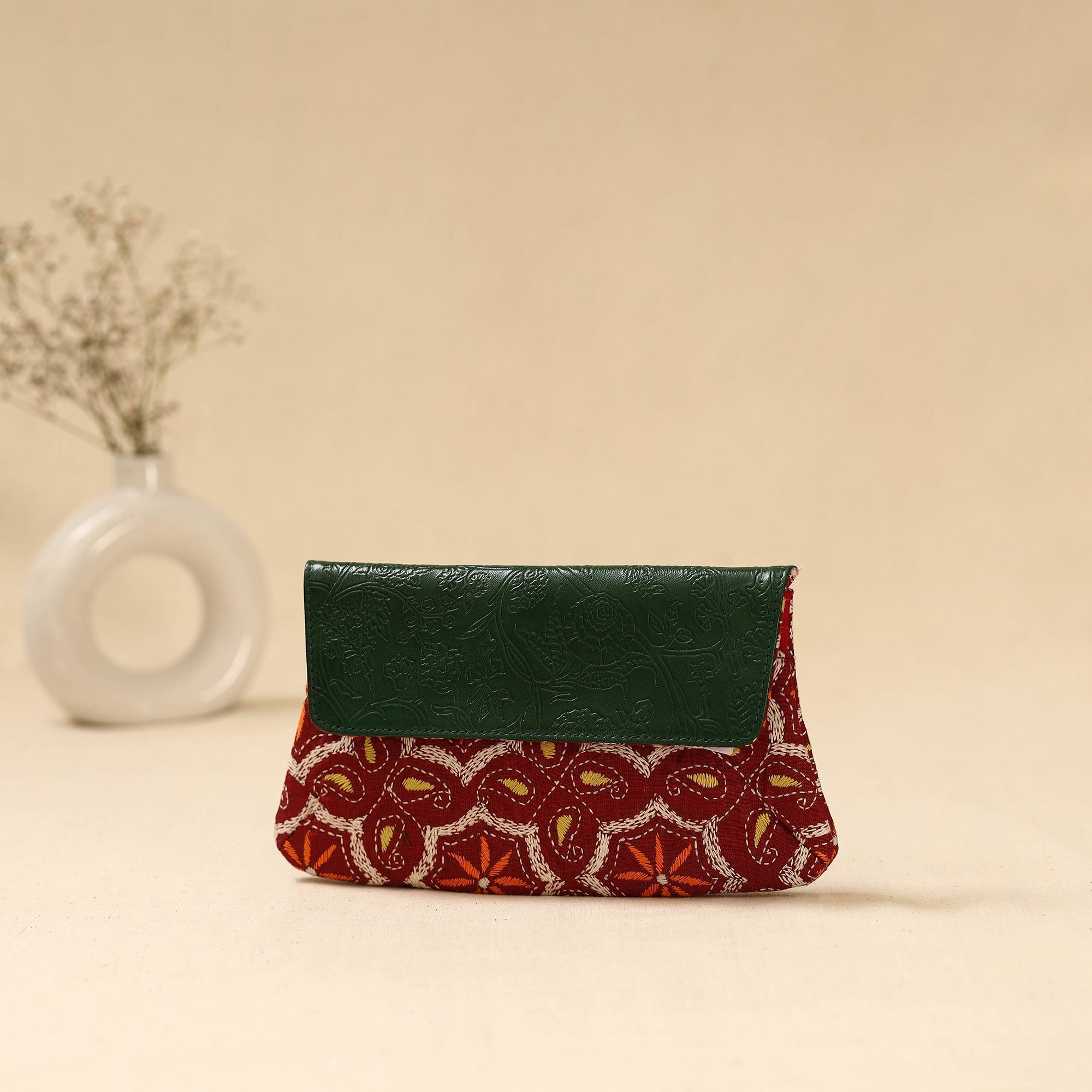 Handcrafted clutch by master artisan Asalkaar from West Bengal, features a kantha work fabric with goat leather flap created using traditional metal die embossing techniques. The flap is individually painted by hand. Inside the clutch is cotton lined and designed with two spacious compartments, two smaller divider pockets in the center and secure zip pocket perfect for organizing essentials like your phone, cards and cash. Over time the leather flap softens and deepens in color adding to its charm.