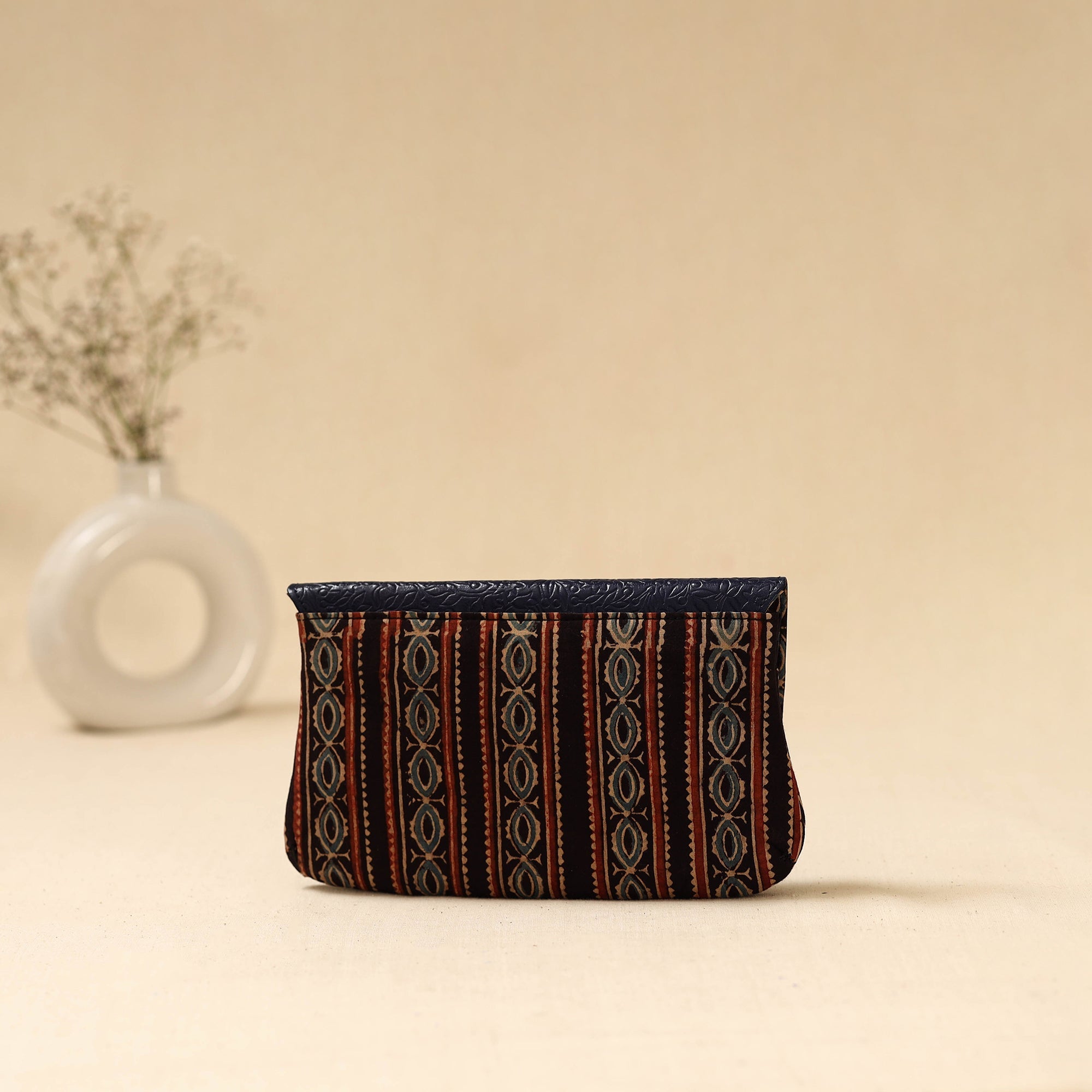 Handcrafted clutch by master artisan Asalkaar from West Bengal, features a hand printed fabric with goat leather flap created using traditional metal die embossing techniques. The flap is individually painted by hand. Inside the clutch is cotton lined and designed with two spacious compartments, two smaller divider pockets in the center and secure zip pocket perfect for organizing essentials like your phone, cards and cash. Over time the leather flap softens and deepens in color adding to its charm.