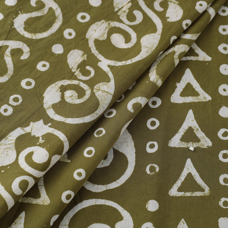 This fine quality olive green pure cotton fabric is hand batik printed, showcasing the beautiful and traditional wax-resist dyeing technique. The intricate designs and motifs are a testament to the skill and expertise of Indian artisans, who have been passing down these techniques from generation to generation. With its unique patterns and high-quality material, this fabric is perfect for creating stunning and timeless garments and home decor items.