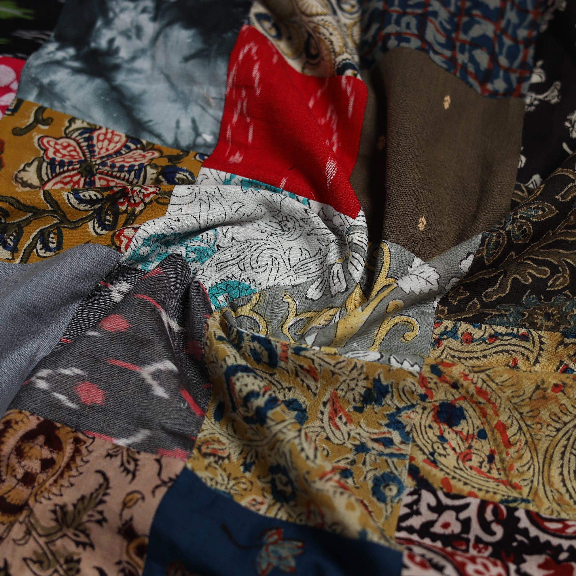 Hand-stitched mosaic cotton unstitched kurta material. Crafted using traditional tukdi (patchwork) techniques this fabric brings together unique textile pieces from various Indian crafts into one beautiful artistic design. Ideal for stitching kurtas, fusion tops or everyday tunics.