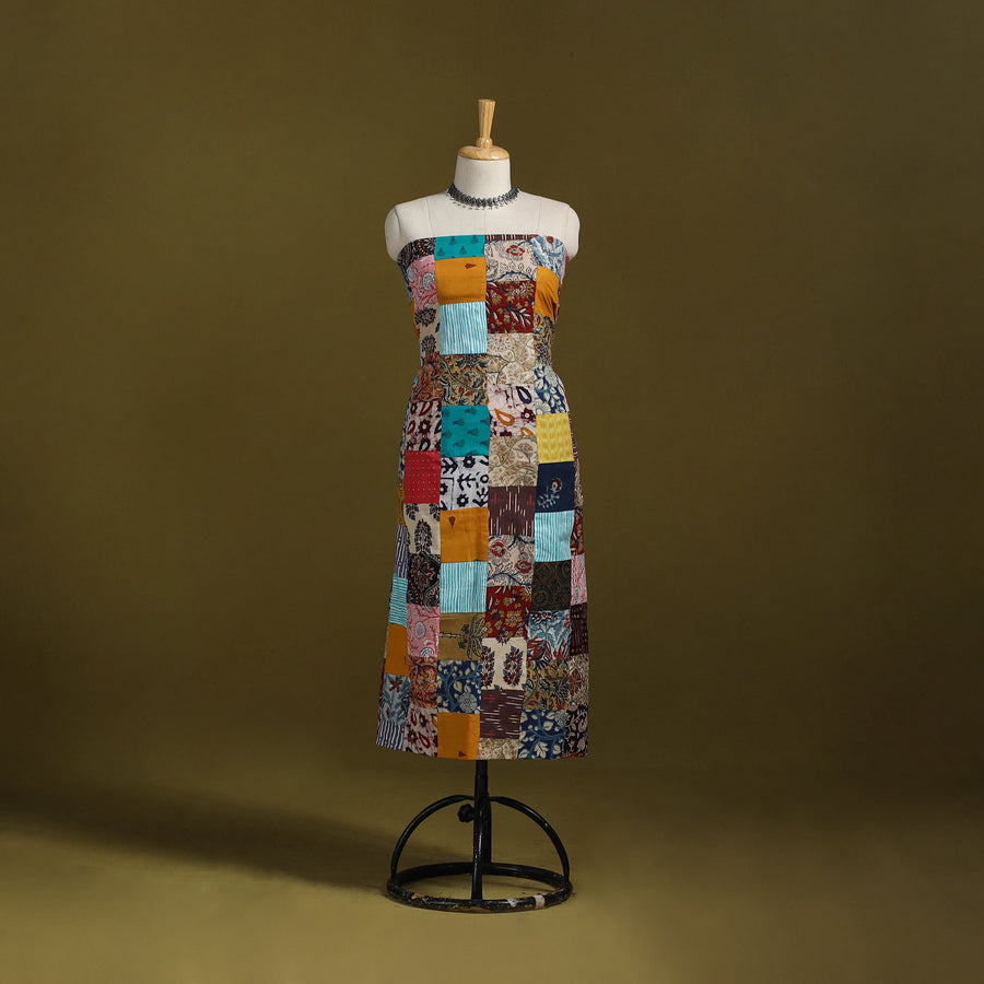 Hand-stitched mosaic cotton unstitched kurta material. Crafted using traditional tukdi (patchwork) techniques this fabric brings together unique textile pieces from various Indian crafts into one beautiful artistic design. Ideal for stitching kurtas, fusion tops or everyday tunics.