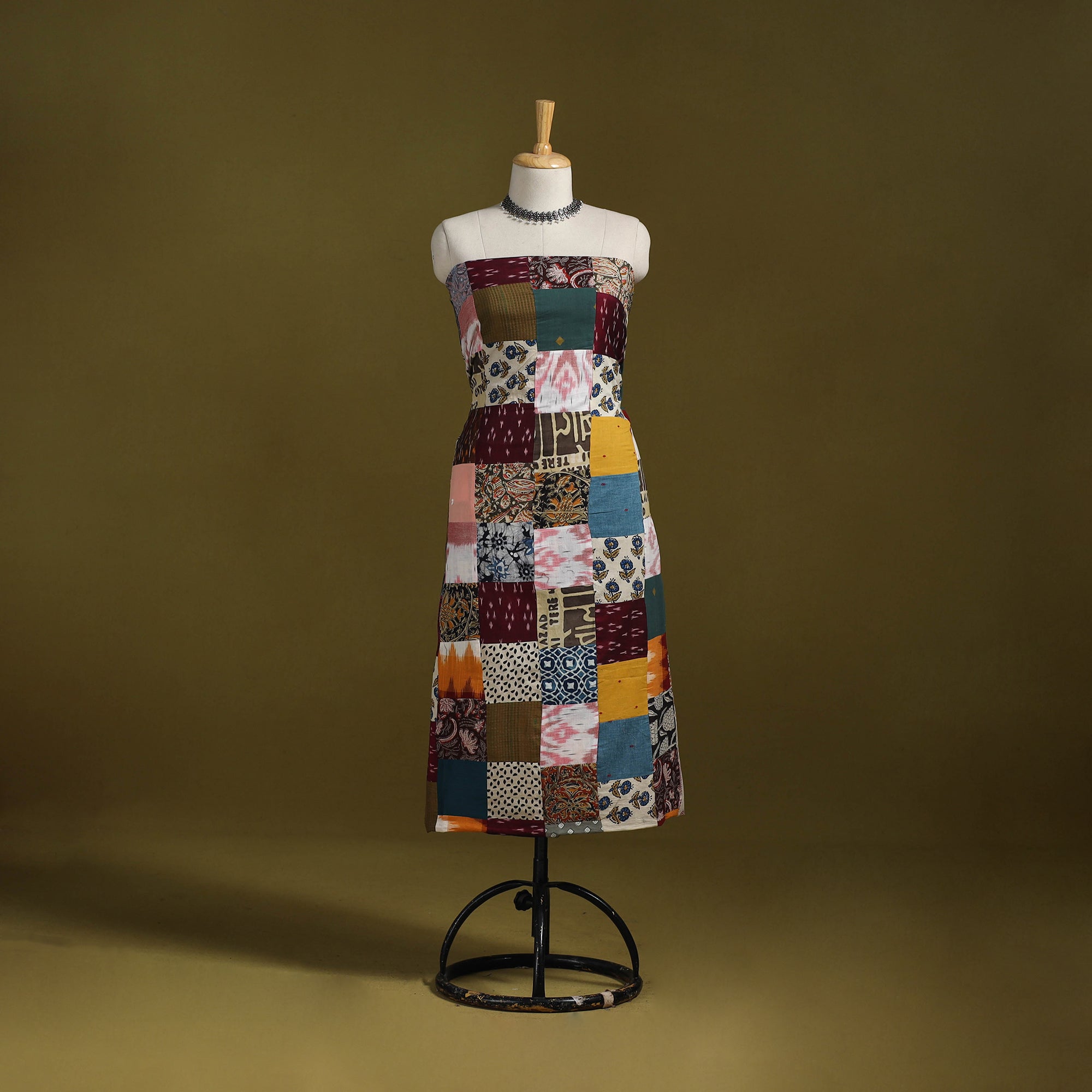 Hand-stitched mosaic cotton unstitched kurta material. Crafted using traditional tukdi (patchwork) techniques this fabric brings together unique textile pieces from various Indian crafts into one beautiful artistic design. Ideal for stitching kurtas, fusion tops or everyday tunics.
