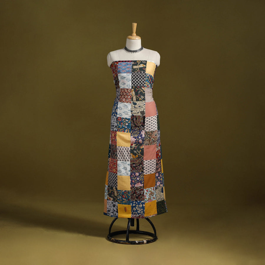 Hand-stitched mosaic cotton unstitched kurta material. Crafted using traditional tukdi (patchwork) techniques this fabric brings together unique textile pieces from various Indian crafts into one beautiful artistic design. Ideal for stitching kurtas, fusion tops or everyday tunics.
