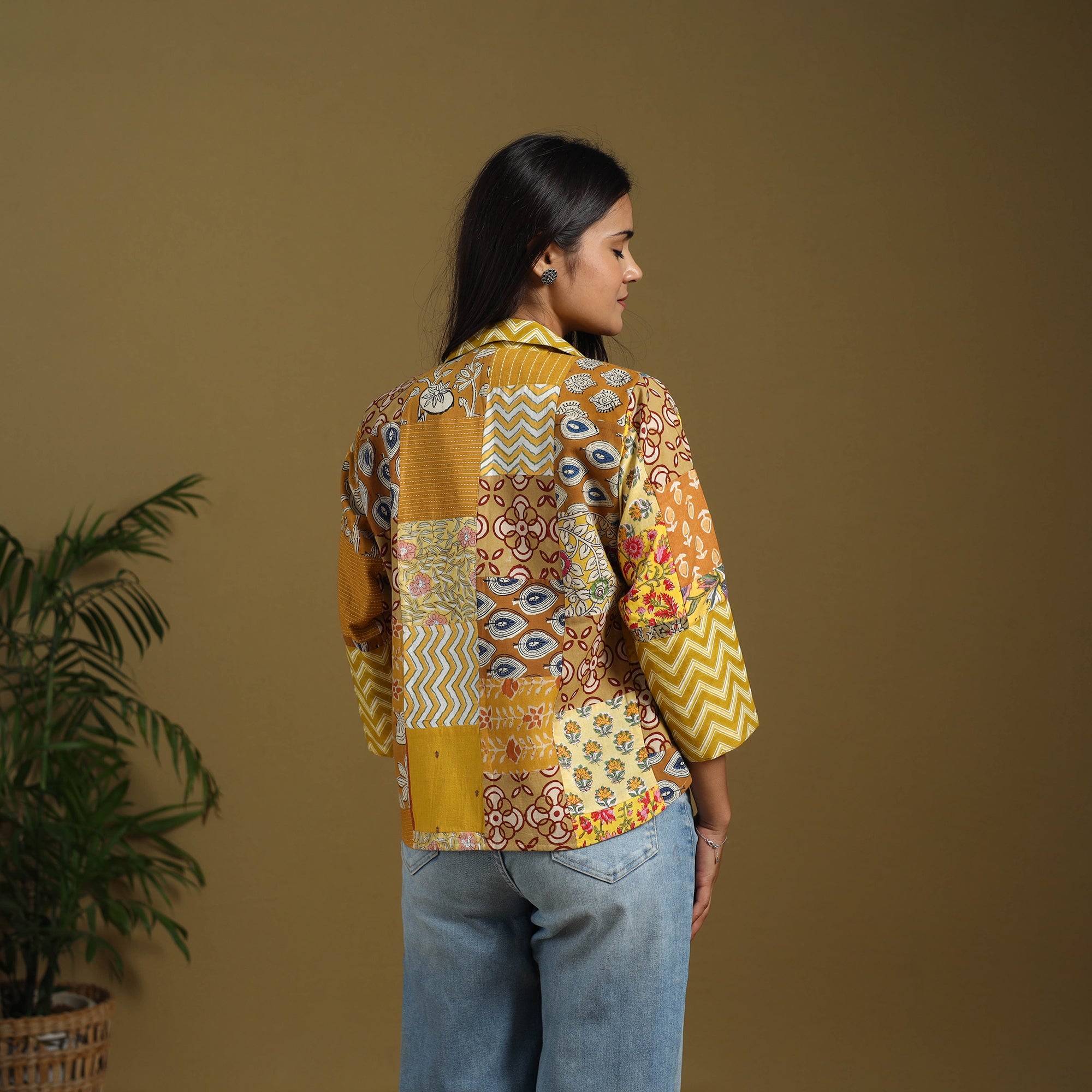 Add a touch of artistic charm to your wardrobe with this yellow hand-stitched mosaic cotton women’s jacket. Featuring a collar, front pockets, and a button closure, it combines style with everyday ease. The mosaic-inspired design adds a distinctive textured look, making it ideal for layering over kurtas, dresses, or casual outfits.