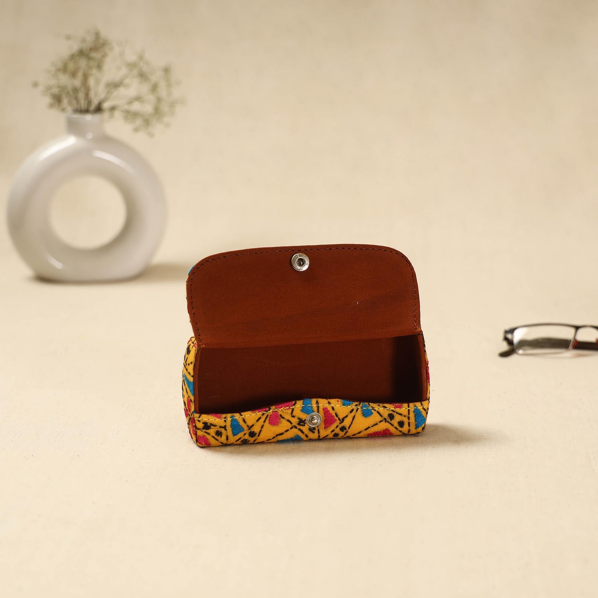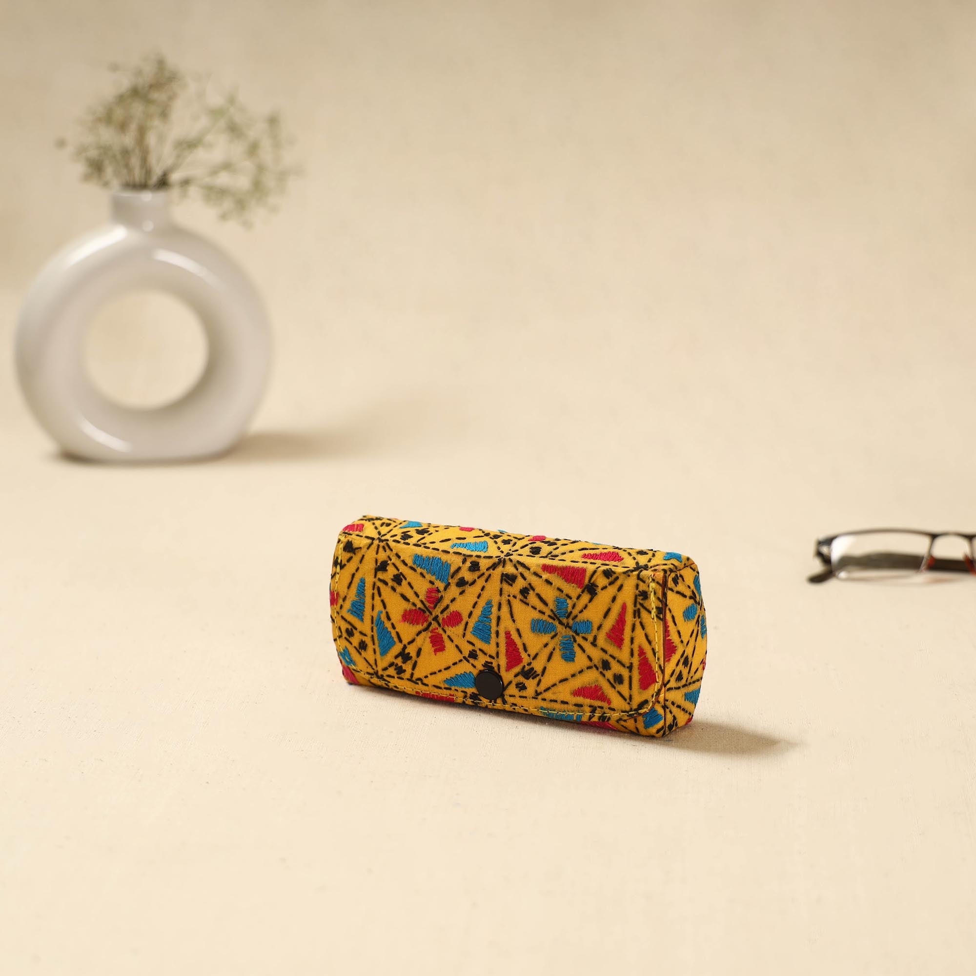 Handcrafted spectacle case features traditional bengal kantha hand embroidery on the exterior. The inside has a soft velvet lining and the sturdy millboard base made from cotton fabric helps protect your glasses from dust and scratches. The snap-button closure keeps your eyewear secure.