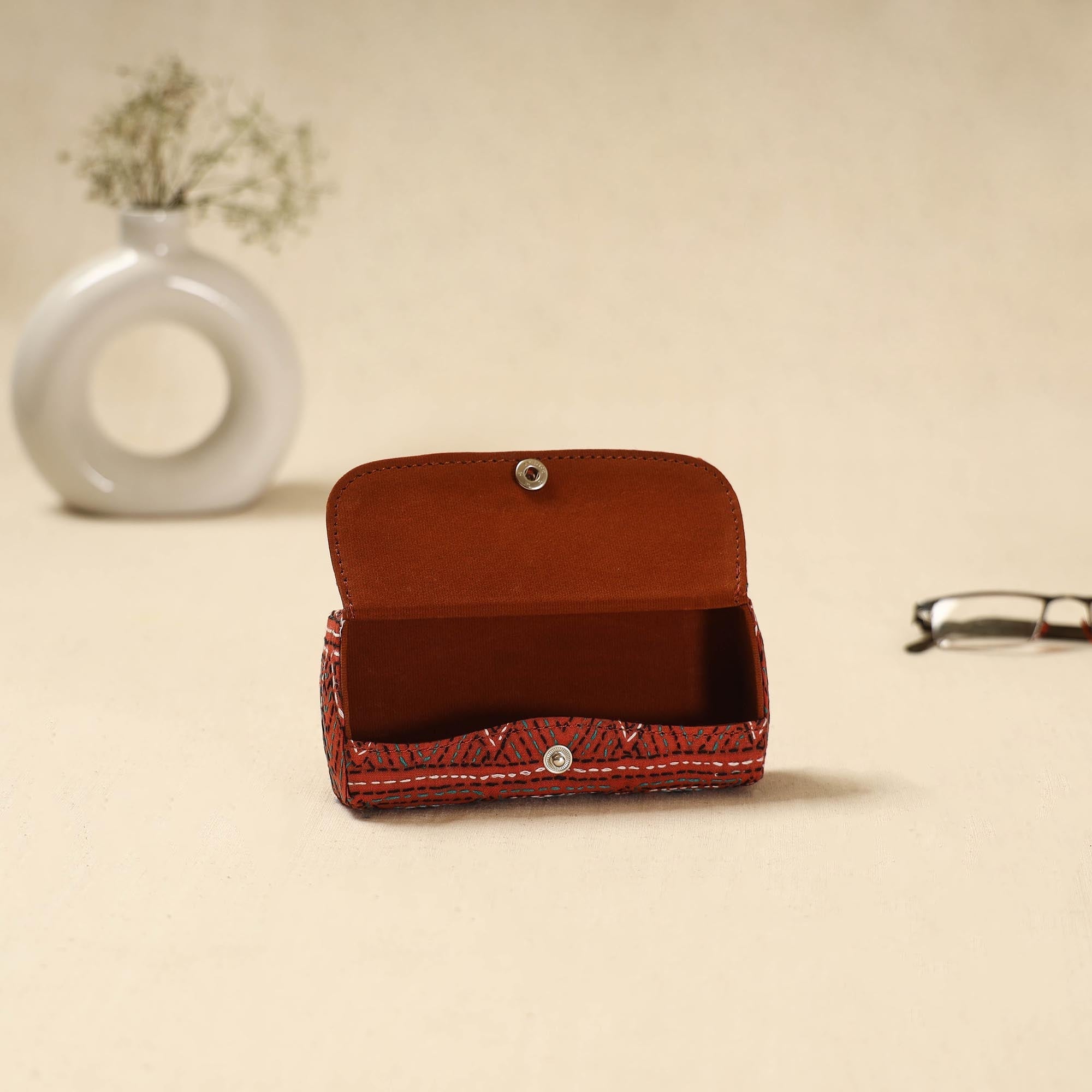 Red handcrafted spectacle case features traditional bengal kantha hand embroidery on the exterior. The inside has a soft velvet lining and the sturdy millboard base made from cotton fabric helps protect your glasses from dust and scratches. The snap-button closure keeps your eyewear secure.