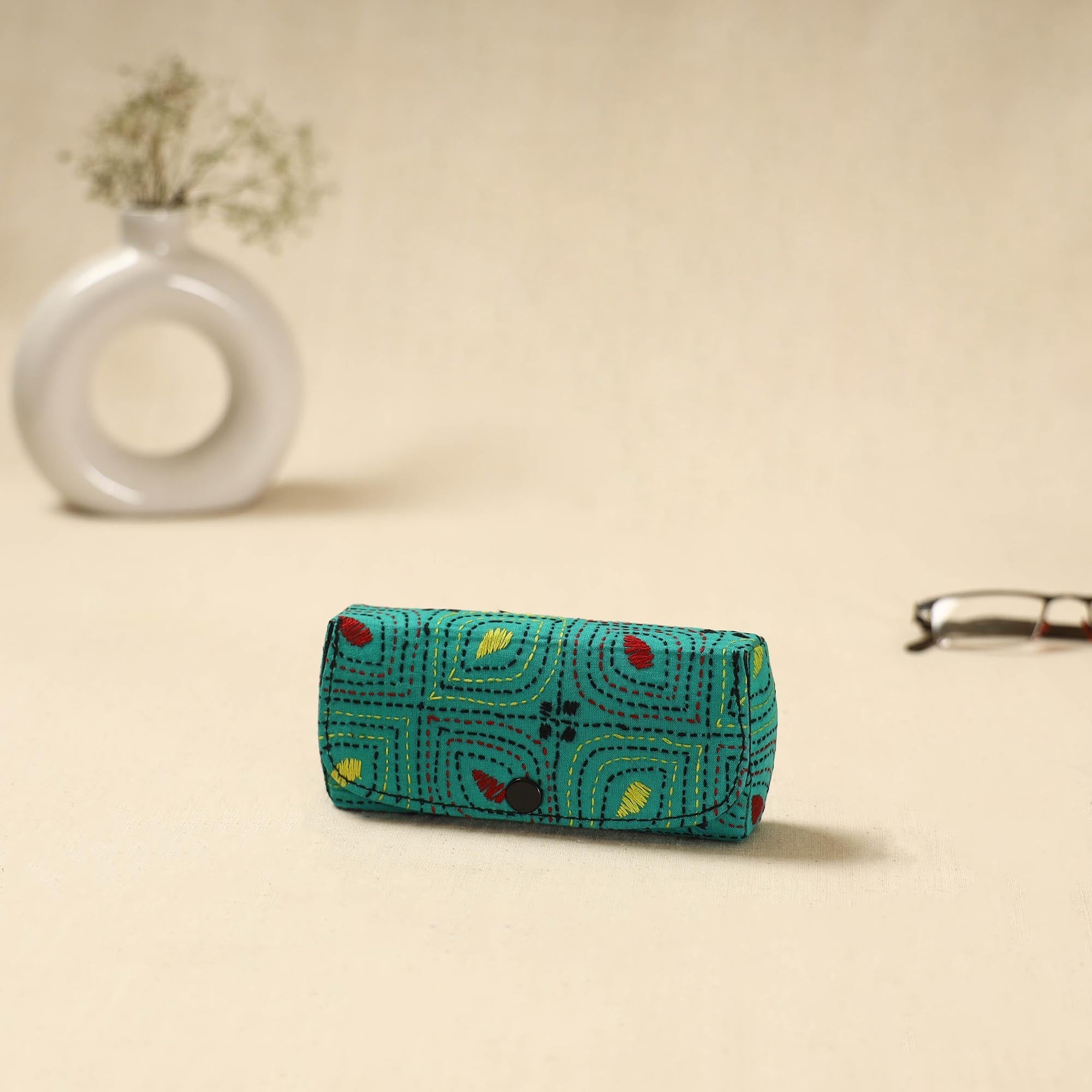 Green handcrafted spectacle case features traditional bengal kantha hand embroidery on the exterior. The inside has a soft velvet lining and the sturdy millboard base made from cotton fabric helps protect your glasses from dust and scratches. The snap-button closure keeps your eyewear secure.