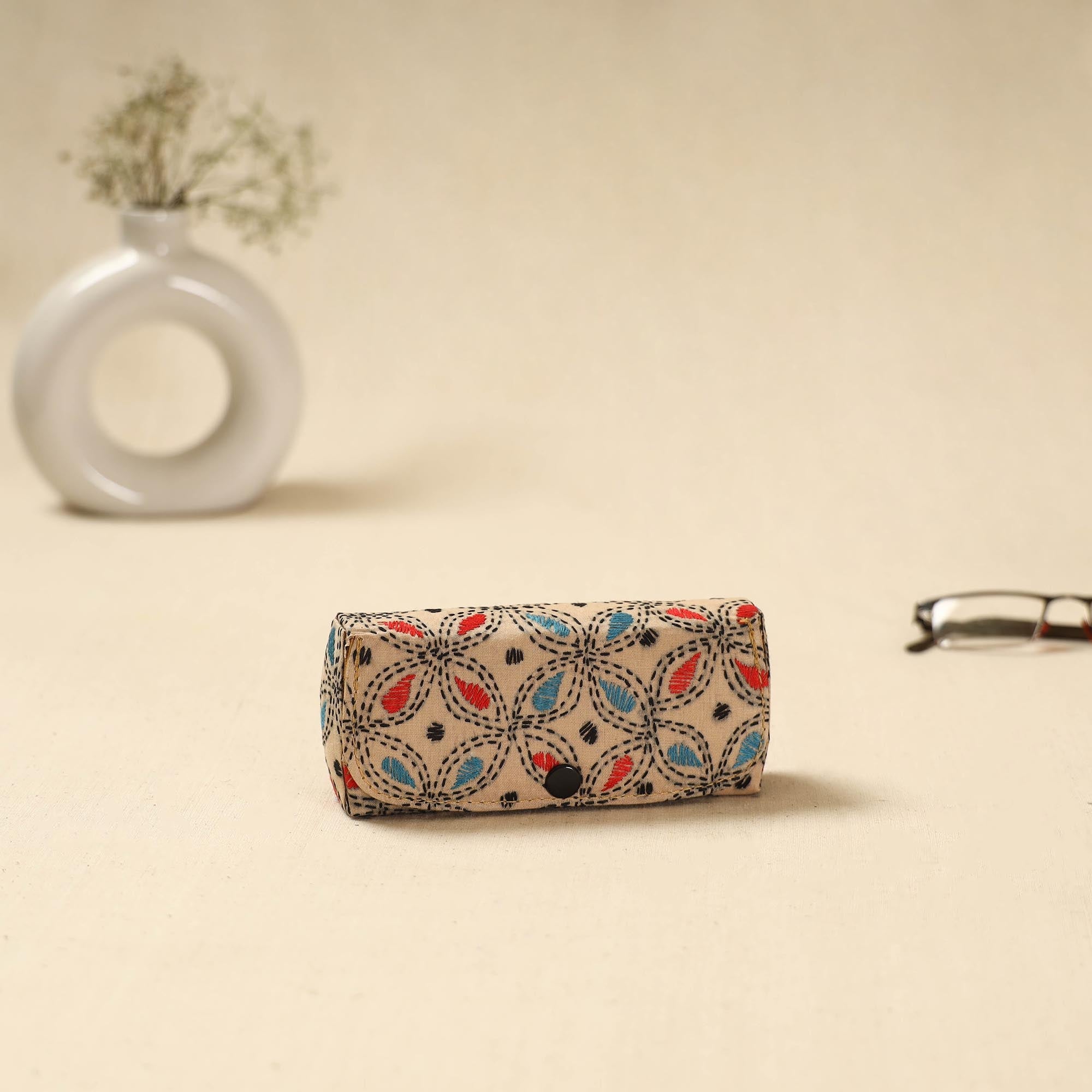 Handcrafted spectacle case features traditional bengal kantha hand embroidery on the exterior. The inside has a soft velvet lining and the sturdy millboard base made from cotton fabric helps protect your glasses from dust and scratches. The snap-button closure keeps your eyewear secure.