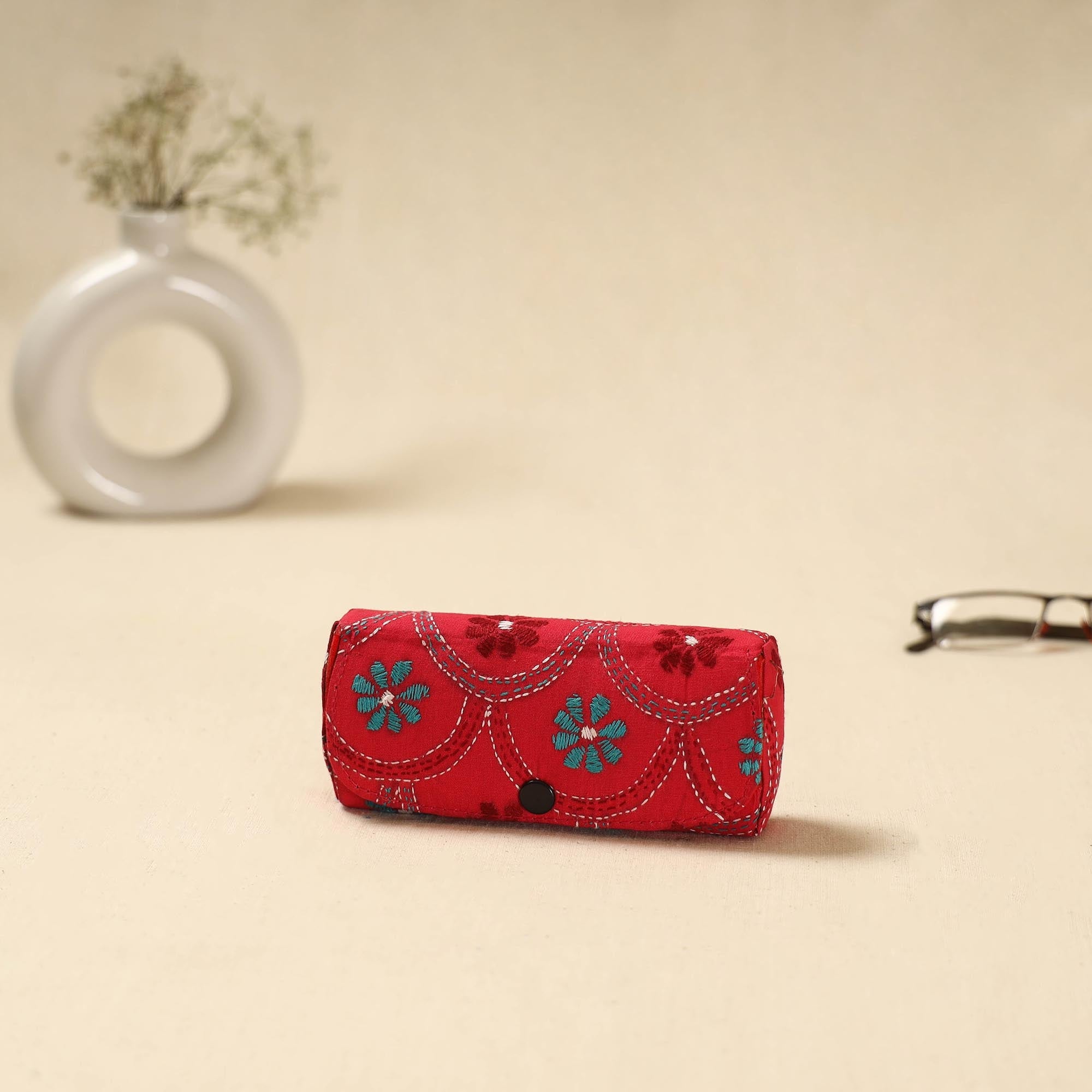 Handcrafted spectacle case features traditional bengal kantha hand embroidery on the exterior. The inside has a soft velvet lining and the sturdy millboard base made from cotton fabric helps protect your glasses from dust and scratches. The snap-button closure keeps your eyewear secure.