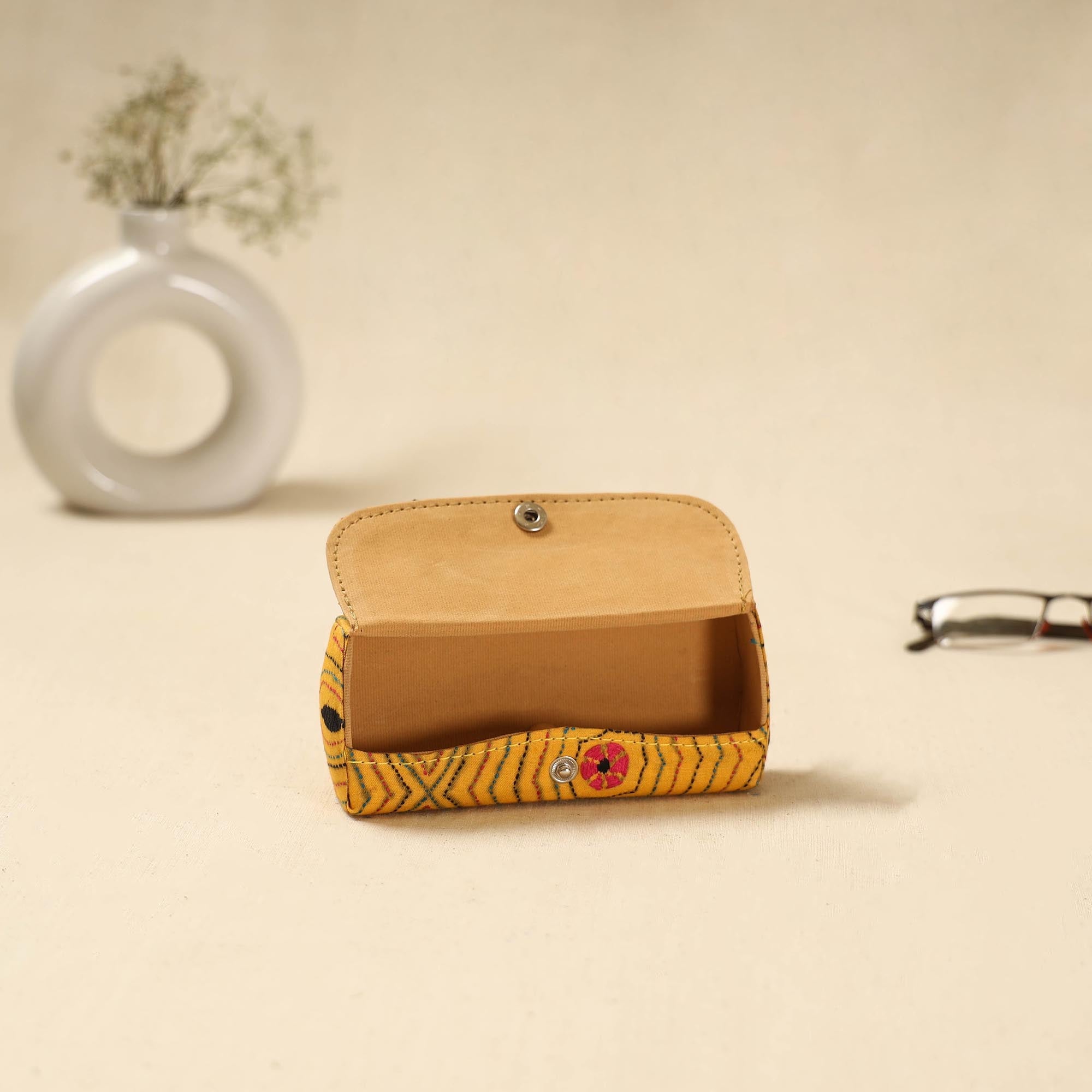 Handcrafted spectacle case features traditional bengal kantha hand embroidery on the exterior. The inside has a soft velvet lining and the sturdy millboard base made from cotton fabric helps protect your glasses from dust and scratches. The snap-button closure keeps your eyewear secure.