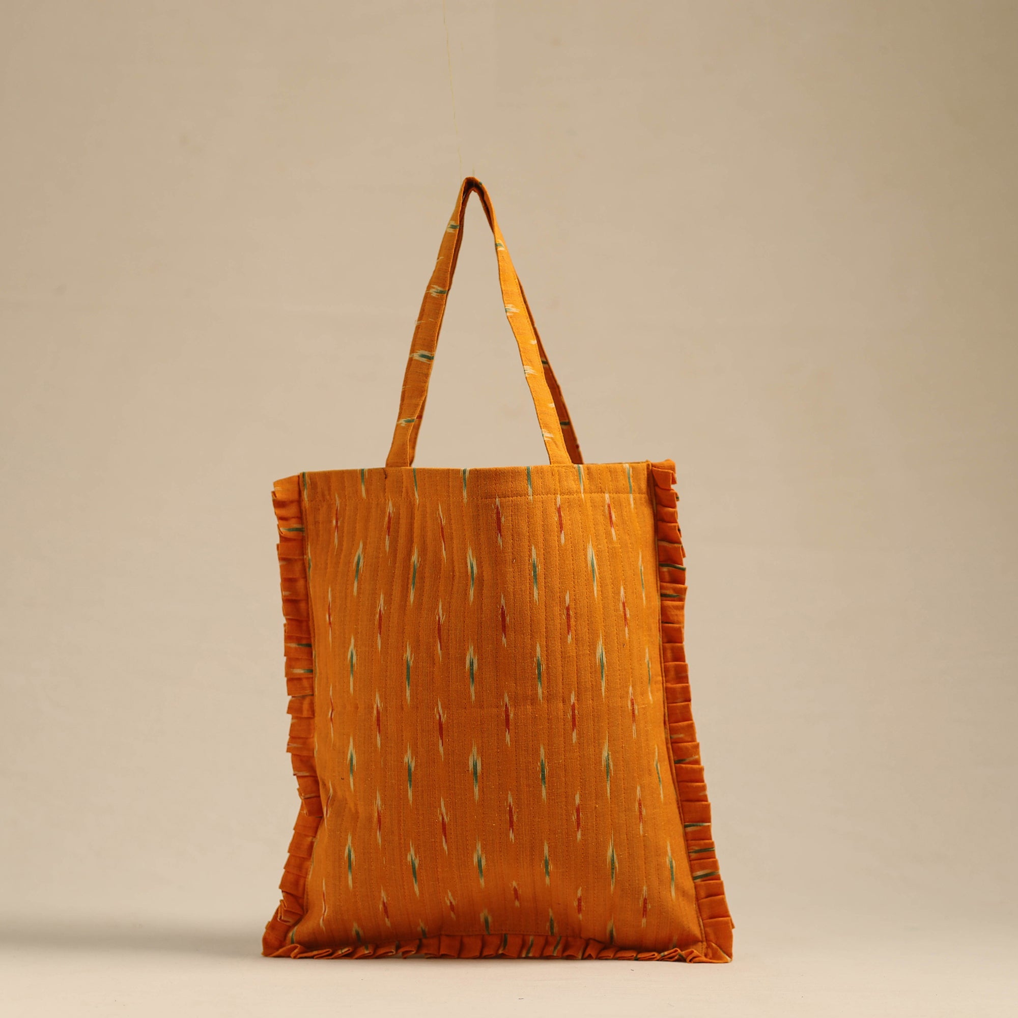 This orange handcrafted cotton frill jhola bag seamlessly blends tradition with modern style. Made from eco-friendly materials, it’s spacious enough to carry your daily essentials while adding a touch of artisanal charm to your outfit.