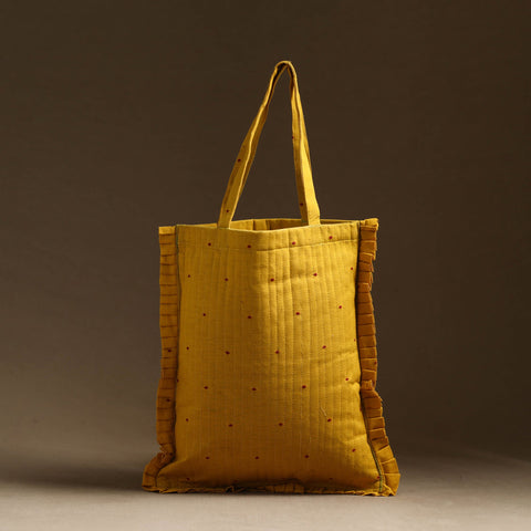 This yellow handcrafted cotton frill jhola bag seamlessly blends tradition with modern style. Made from eco-friendly materials, it’s spacious enough to carry your daily essentials while adding a touch of artisanal charm to your outfit.