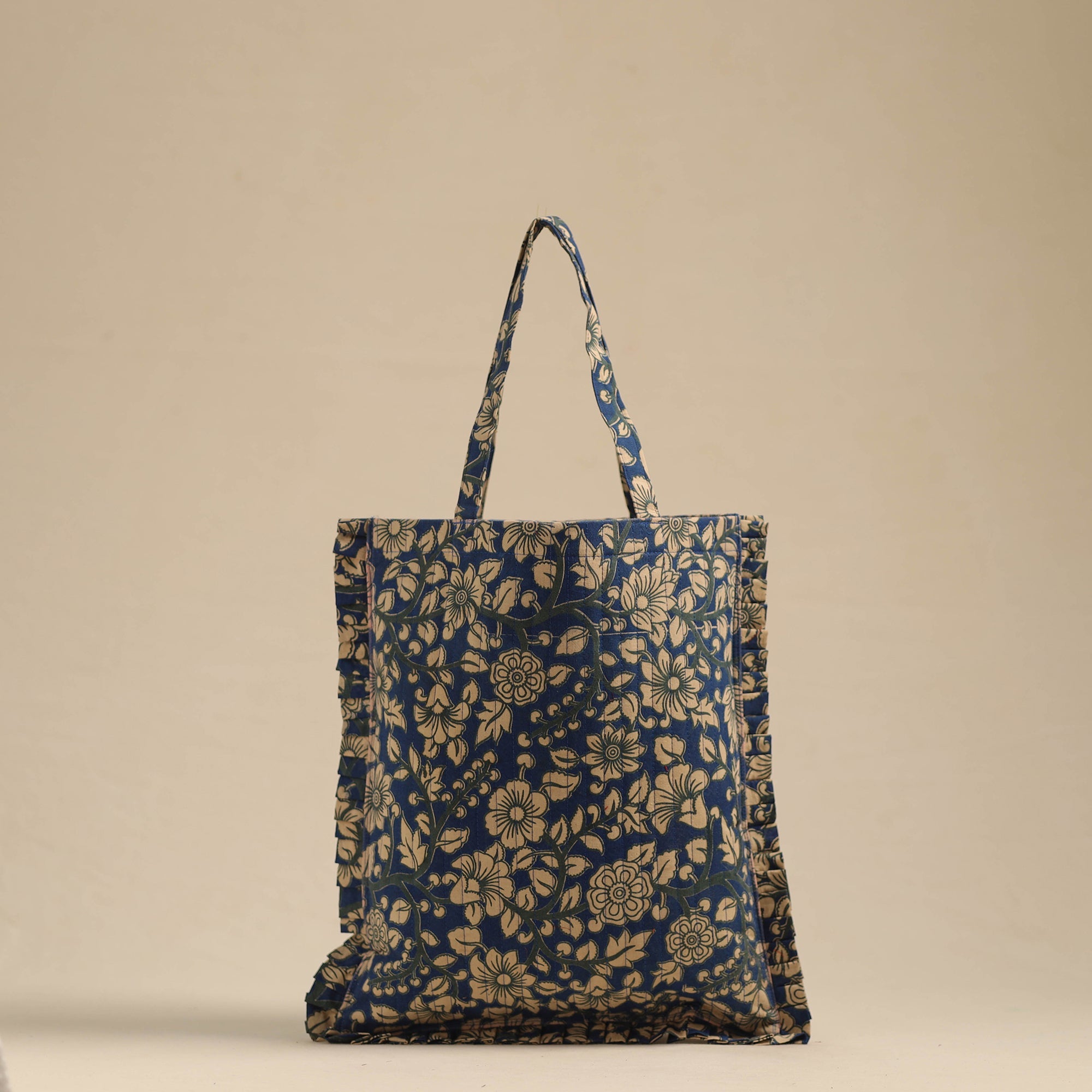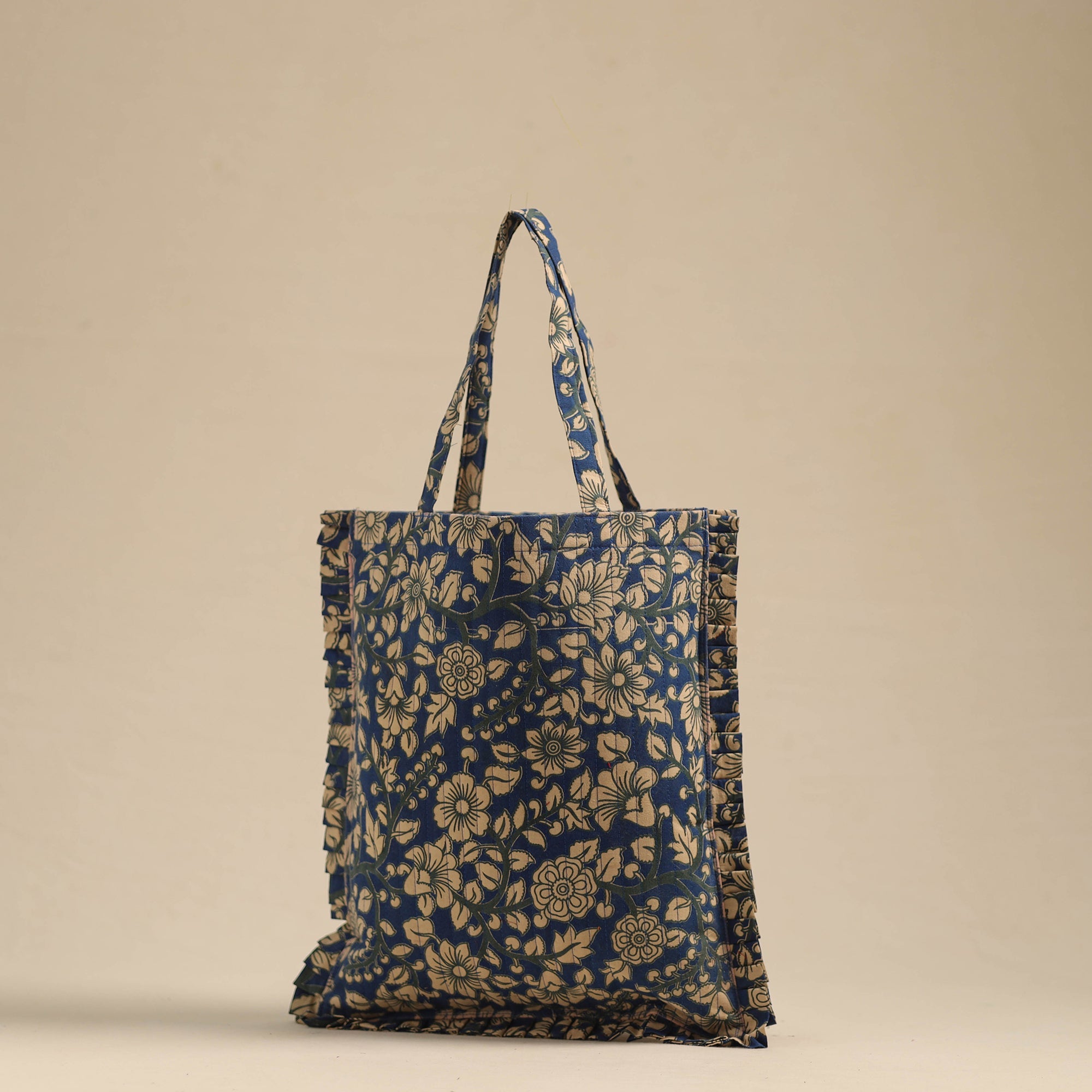 This blue handcrafted cotton frill jhola bag seamlessly blends tradition with modern style. Made from eco-friendly materials, it’s spacious enough to carry your daily essentials while adding a touch of artisanal charm to your outfit.