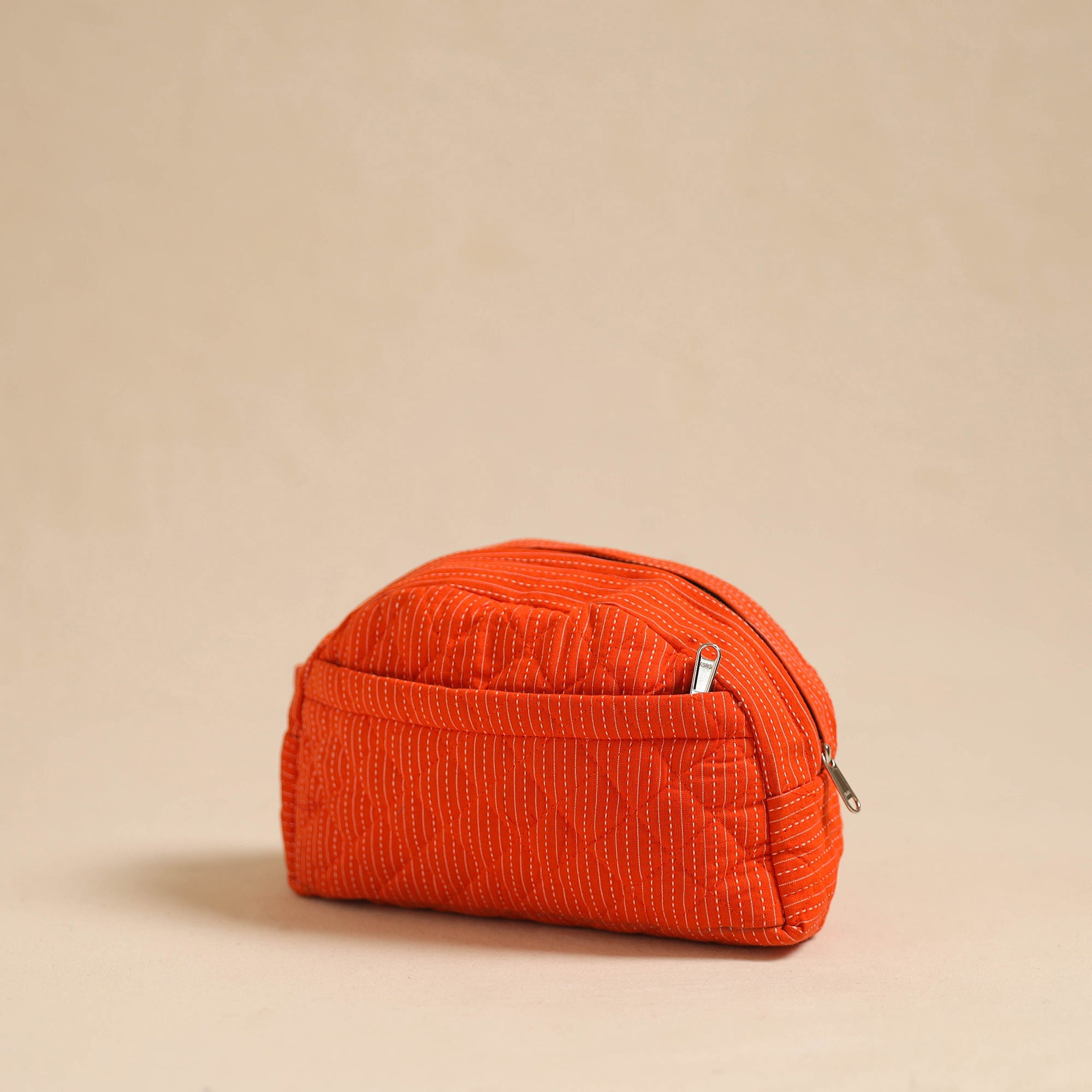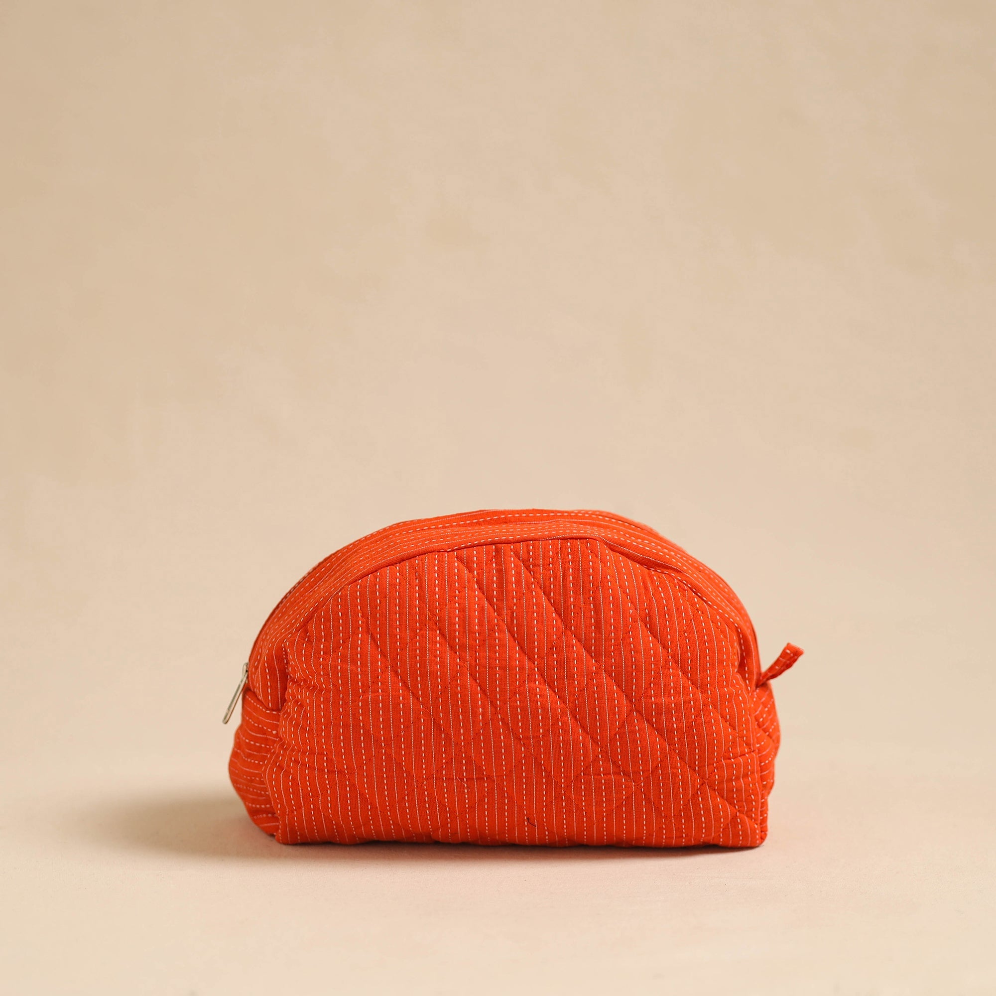 This orange handcrafted cotton quilted cosmetic pouch features a convenient front pocket for extra storage. With a waterproof lining, it’s perfect for organizing toiletries, cosmetics, or travel essentials. It keeps your belongings secure and easily accessible, whether at home or on the go.