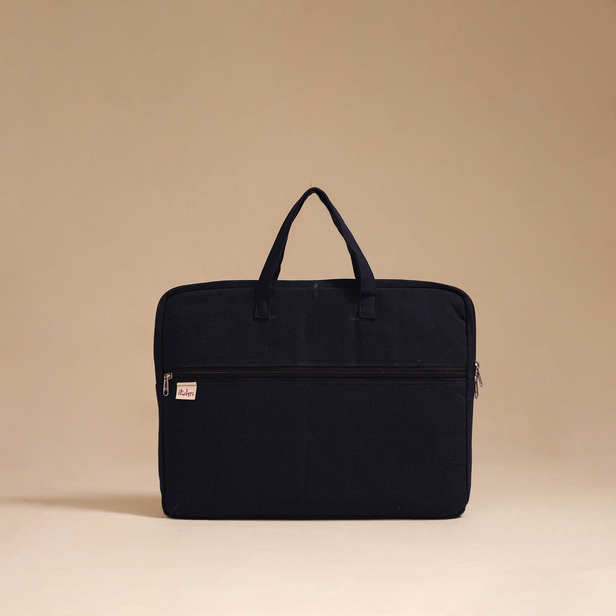 Keep your laptop safe and stylish with this beautifully black quilted cotton laptop bag made by iTokri’s artisans. It features soft inner padding for extra protection, it offers gentle protection against bumps and scratches. The sturdy fabric handles ensure easy handling, while the spacious compartment fits most laptops with ease. A front zipper pocket adds convenience for storing daily essentials during travel or work.