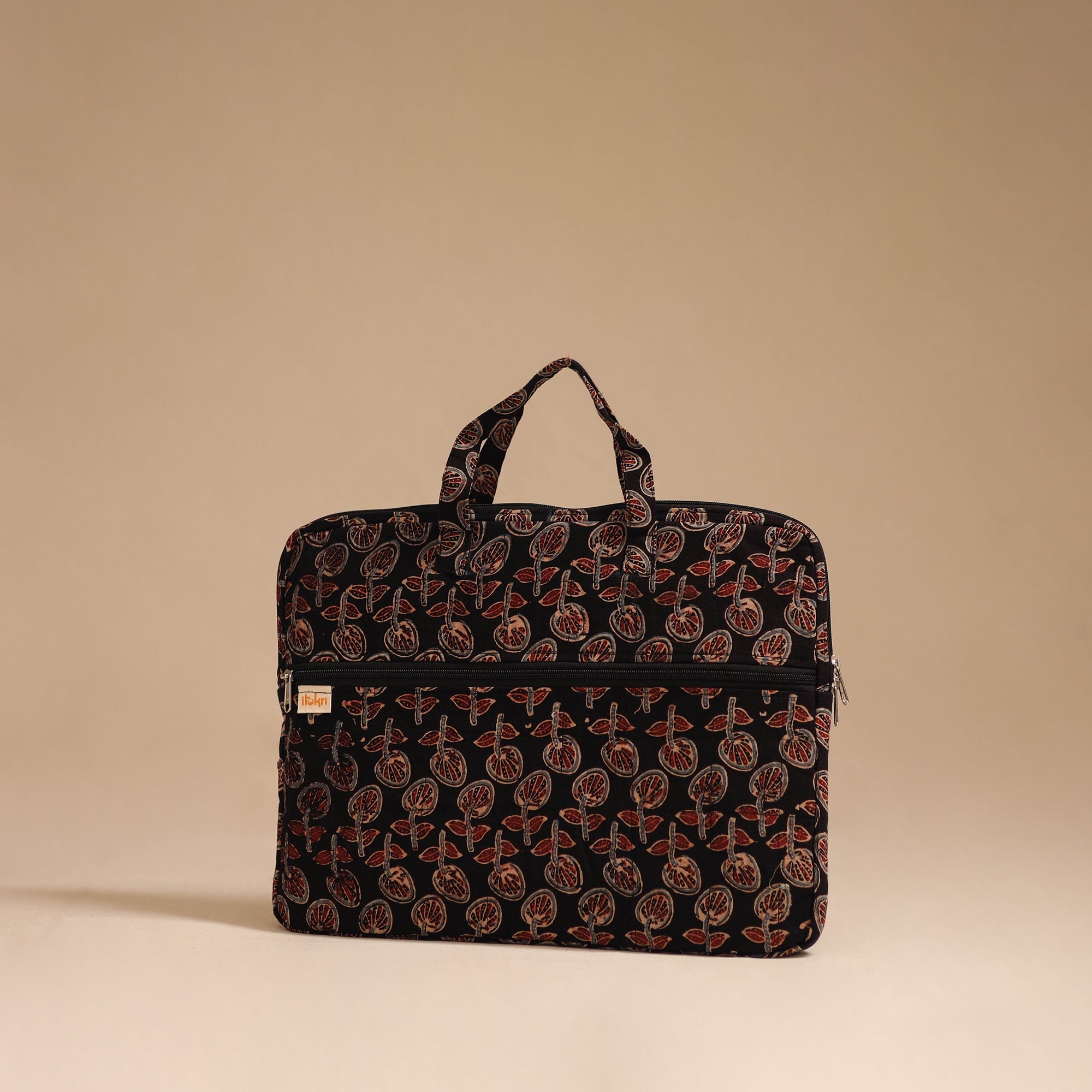 Keep your laptop safe and stylish with this beautifully black quilted cotton laptop bag made by iTokri’s artisans. It features soft inner padding for extra protection, it offers gentle protection against bumps and scratches. The sturdy fabric handles ensure easy handling, while the spacious compartment fits most laptops with ease. A front zipper pocket adds convenience for storing daily essentials during travel or work.