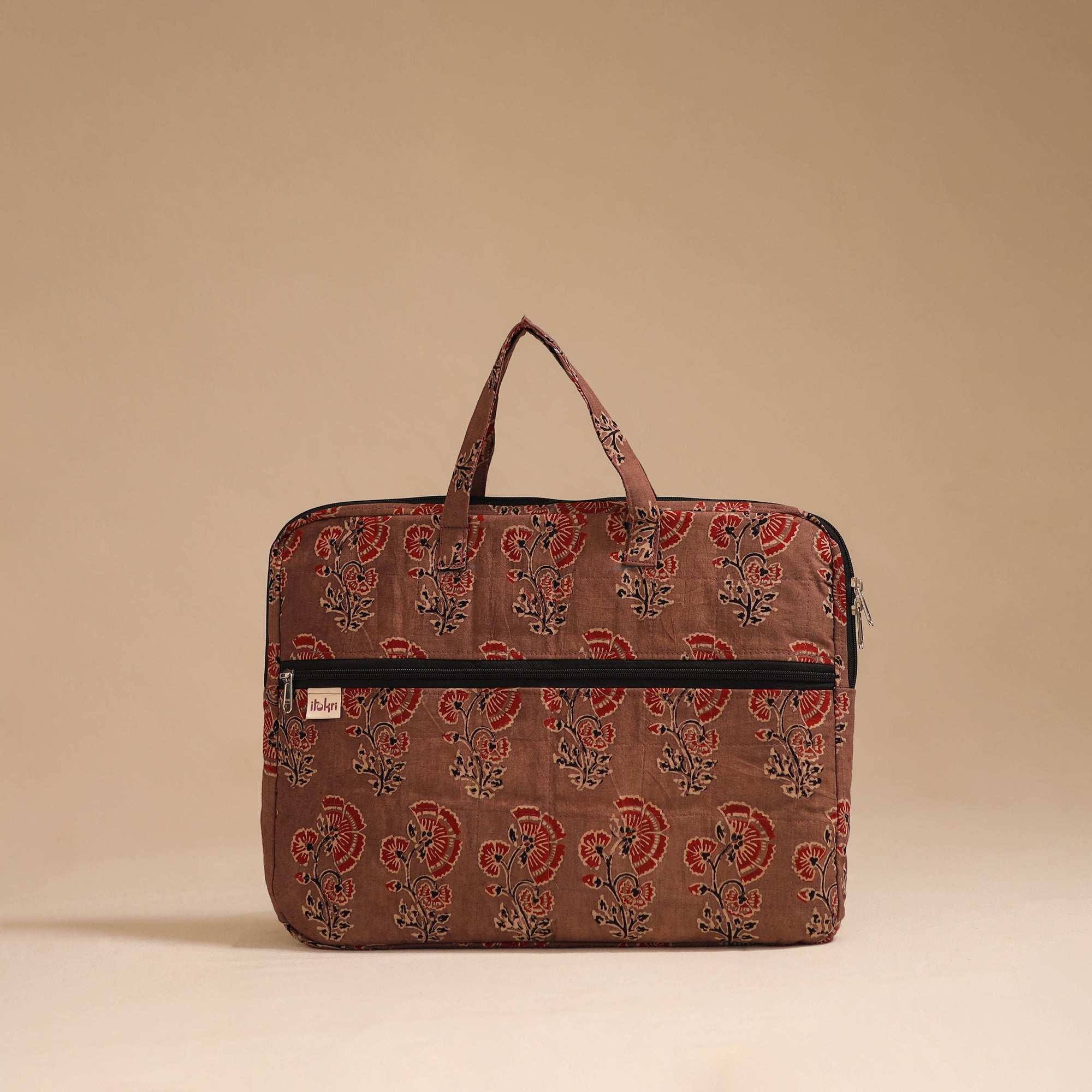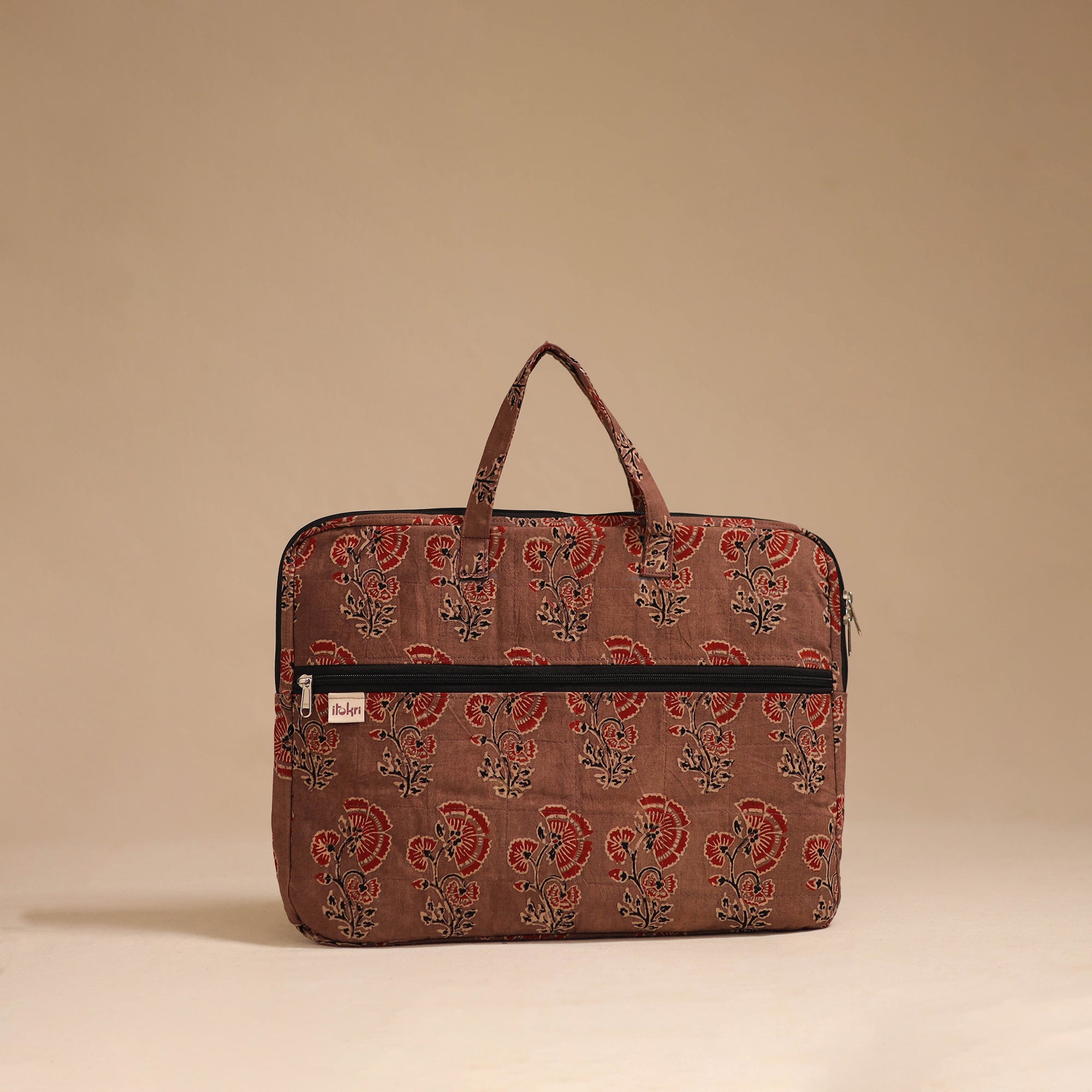 Keep your laptop safe and stylish with this beautifully brown quilted cotton laptop bag made by iTokri’s artisans. It features soft inner padding for extra protection, it offers gentle protection against bumps and scratches. The sturdy fabric handles ensure easy handling, while the spacious compartment fits most laptops with ease. A front zipper pocket adds convenience for storing daily essentials during travel or work.