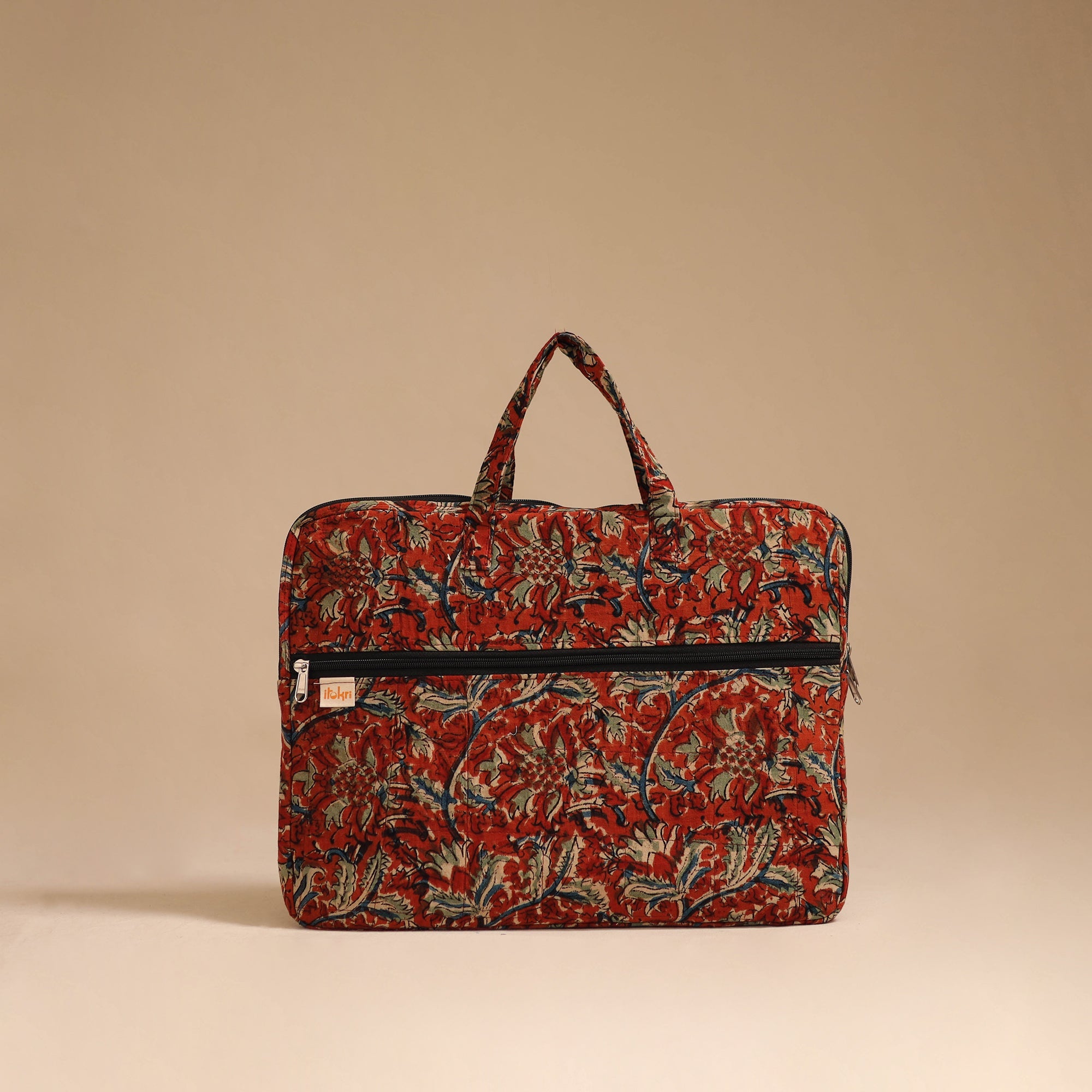 Keep your laptop safe and stylish with this beautifully red quilted cotton laptop bag made by iTokri’s artisans. It features soft inner padding for extra protection, it offers gentle protection against bumps and scratches. The sturdy fabric handles ensure easy handling, while the spacious compartment fits most laptops with ease. A front zipper pocket adds convenience for storing daily essentials during travel or work.