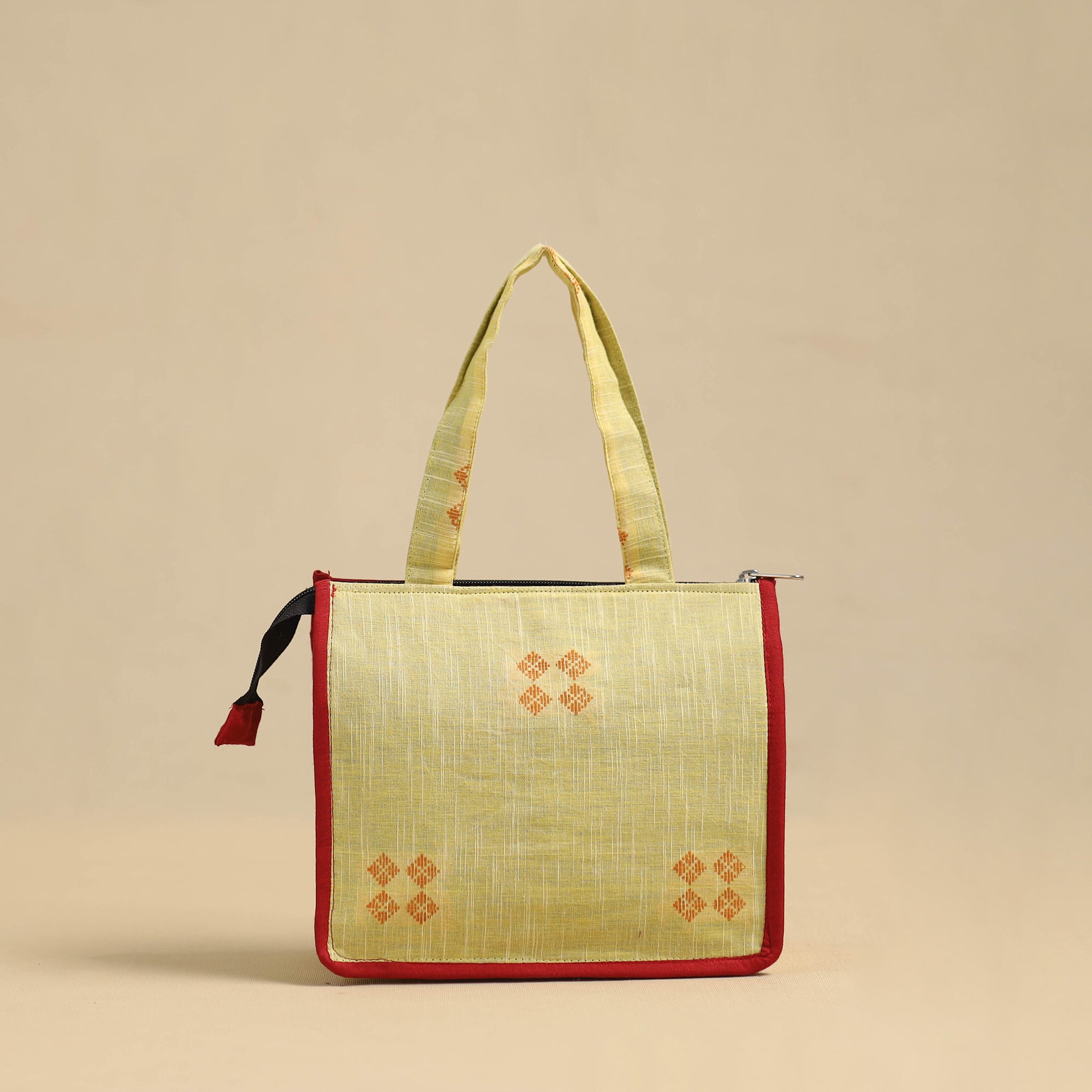 This yellow handcrafted cotton small hand bag for women combines timeless style with functionality. Made by skilled artisans, it features ample space for daily essentials, an internal zipped pocket, and a convenient front pocket. Perfect for daily use or special occasions.