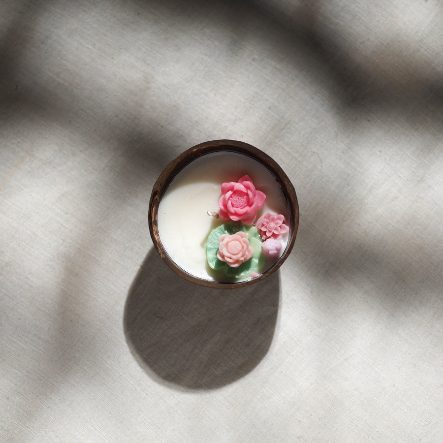 Handcrafted eco-friendly coconut shell soy scented candle is made using natural dry coconut shells and coconut wax. Decorated with delicate designs, it adds a calming and aesthetic touch to any space. Perfect for gifting, home decor or festive occasions bringing warmth, charm and a gentle aroma to your surroundings.