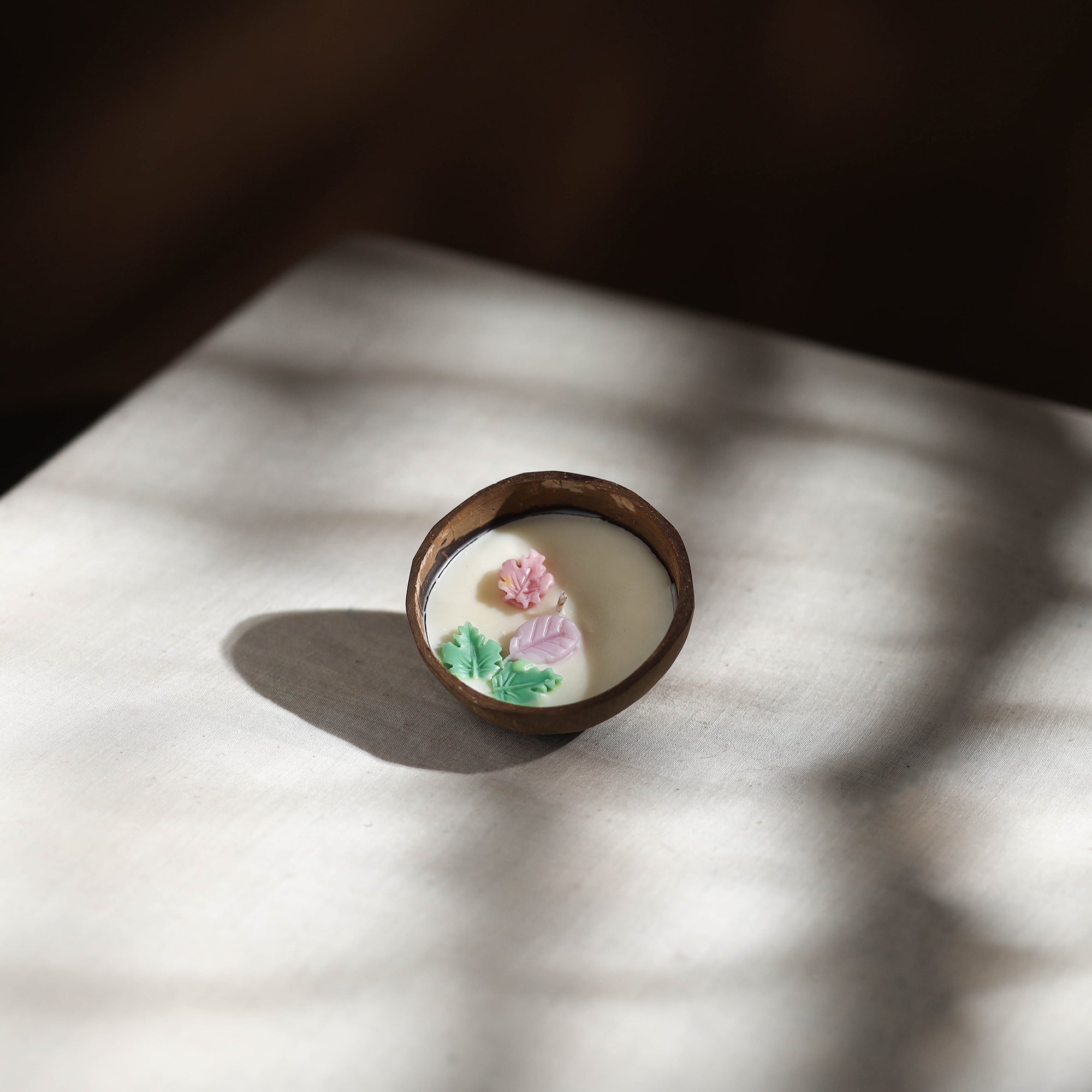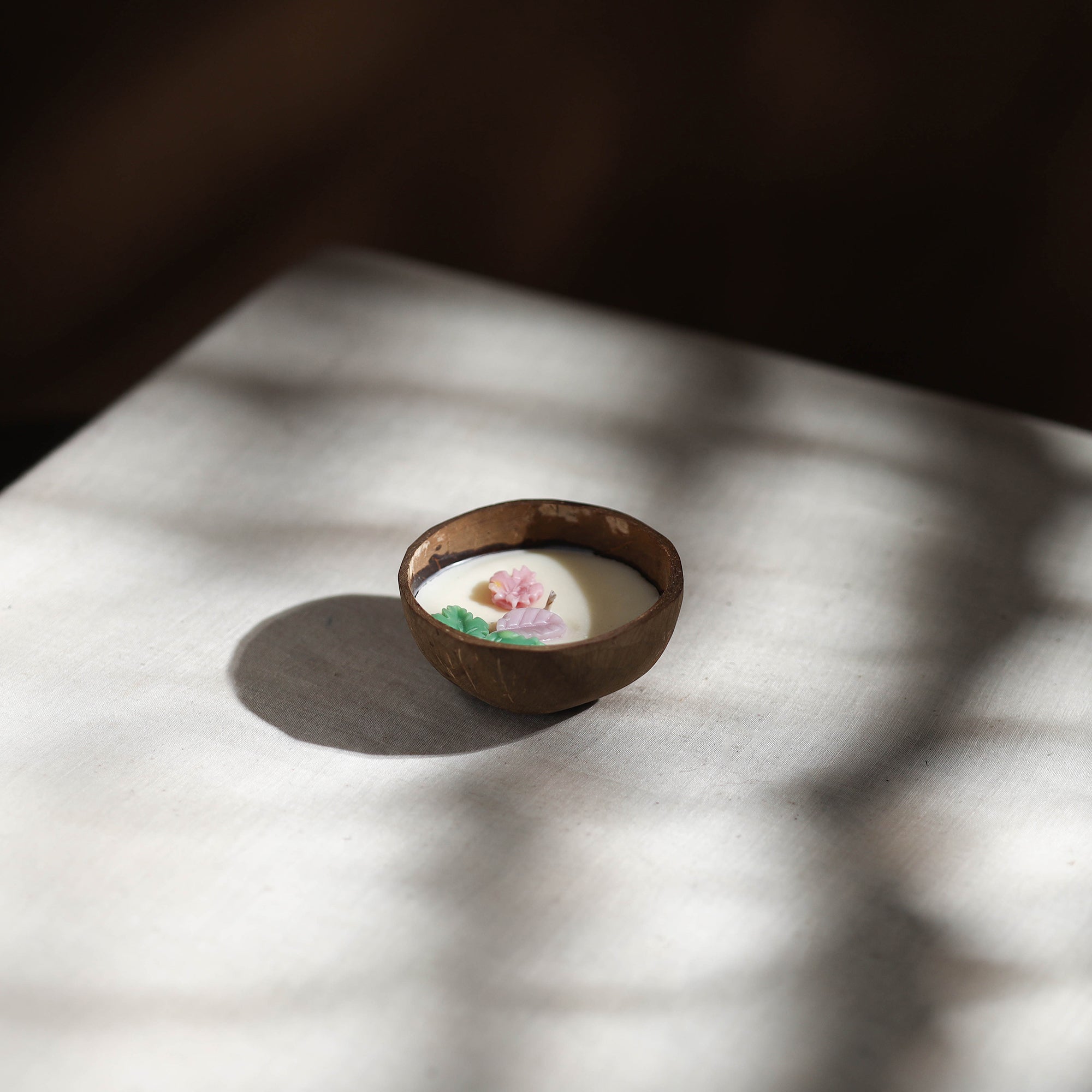 Handcrafted eco-friendly coconut shell soy scented candle is made using natural dry coconut shells and coconut wax. Decorated with delicate designs, it adds a calming and aesthetic touch to any space. Perfect for gifting, home decor or festive occasions bringing warmth, charm and a gentle aroma to your surroundings.