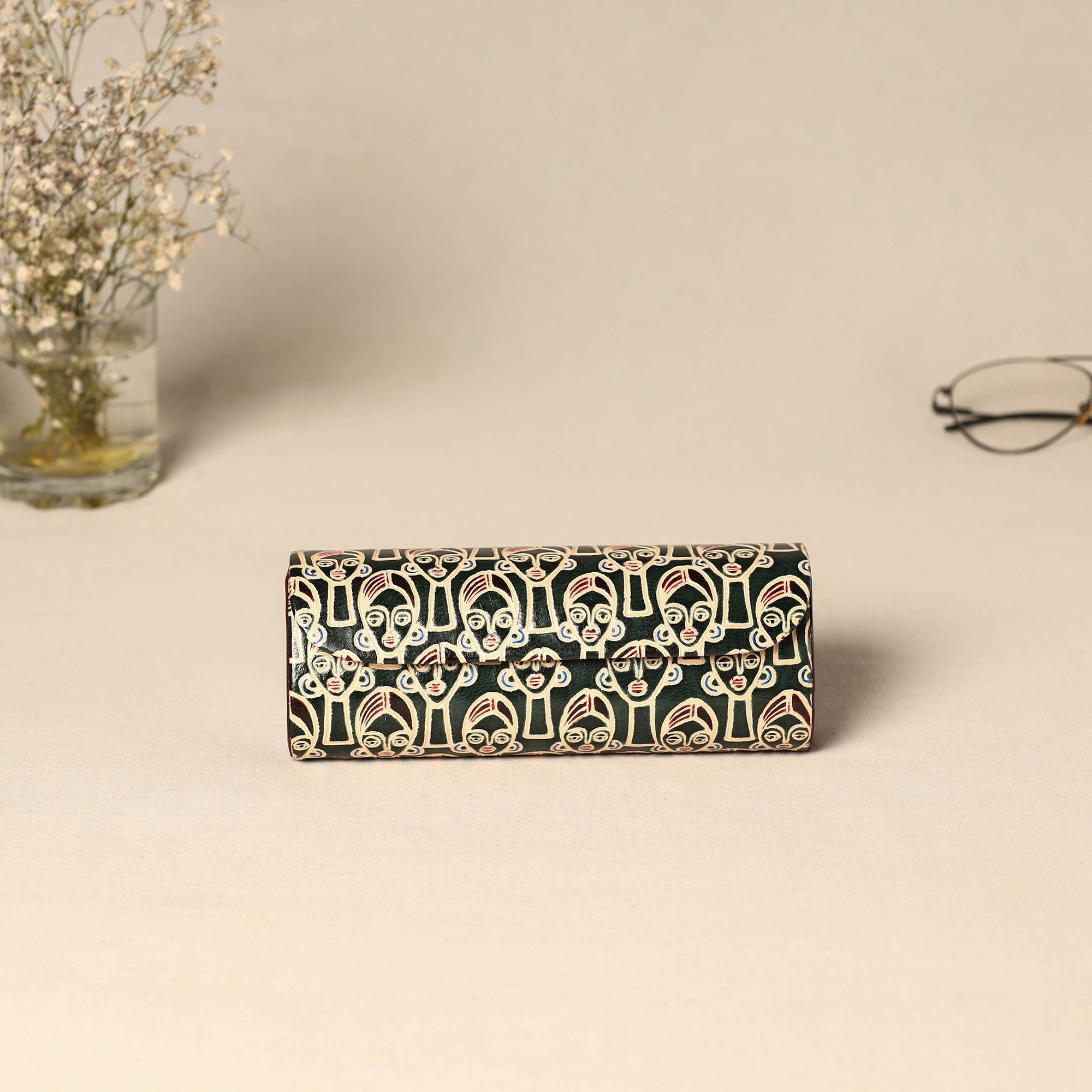 Handcrafted green spectacle case by master artisan Asalkaar from West Bengal, made using fine goat leather. Each piece is embossed with a metal die and painted by hand. Over time, it becomes softer and develops a deeper colour.