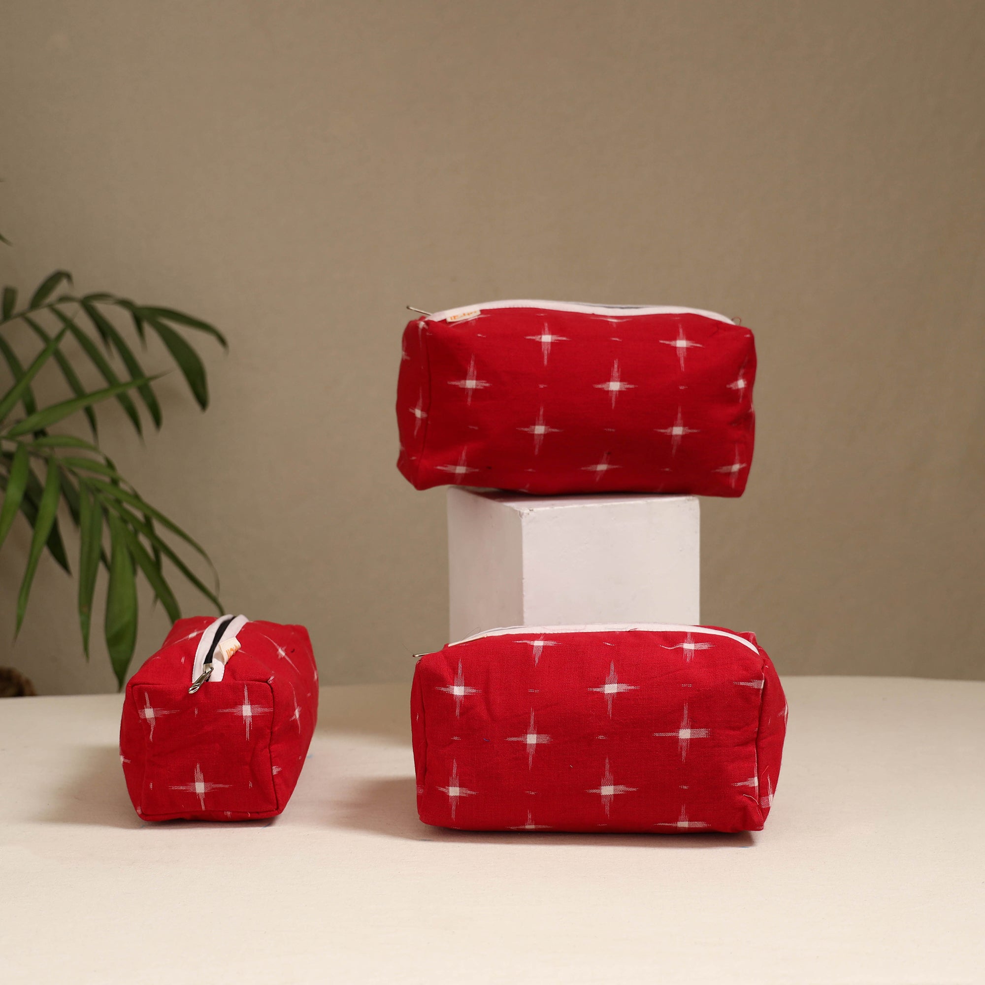 Handcrafted fabric toiletry bags designed with beautiful detailing. Made from cotton with a waterproof lining, The set includes three sizes for streamlined organisation of essentials, making it ideal for travel or vanity storage. Place it within larger carryalls, or coordinate it with cotton pouches and soft bath linens for a consistent, functional setup, whether stored in a dressing cabinet or carried on weekend getaways.