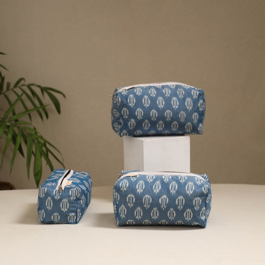 Blue handcrafted fabric toiletry bags designed with beautiful detailing. Made from cotton with a waterproof lining, The set includes three sizes for streamlined organisation of essentials, making it ideal for travel or vanity storage. Place it within larger carryalls, or coordinate it with cotton pouches and soft bath linens for a consistent, functional setup, whether stored in a dressing cabinet or carried on weekend getaways.