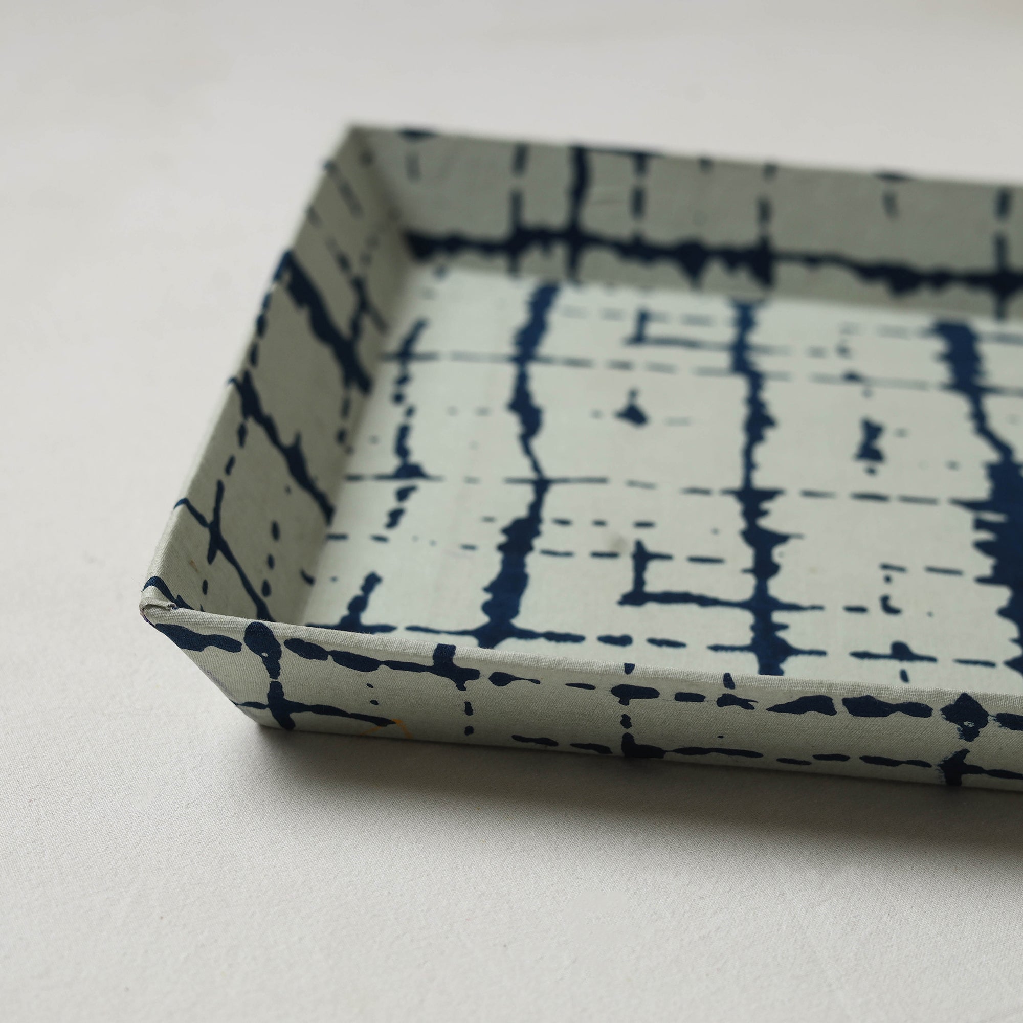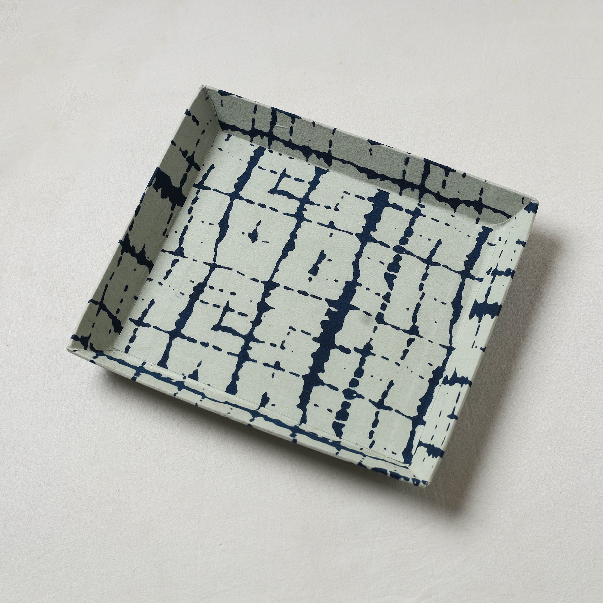 This handcrafted white valet tray has cotton fabric on top and strong cardboard inside. It’s perfect for keeping keys, coins, jewelry, or small desk items in one place. You can also use it for decoration. Its lovely print adds a nice touch to your table, bedside, or entryway.